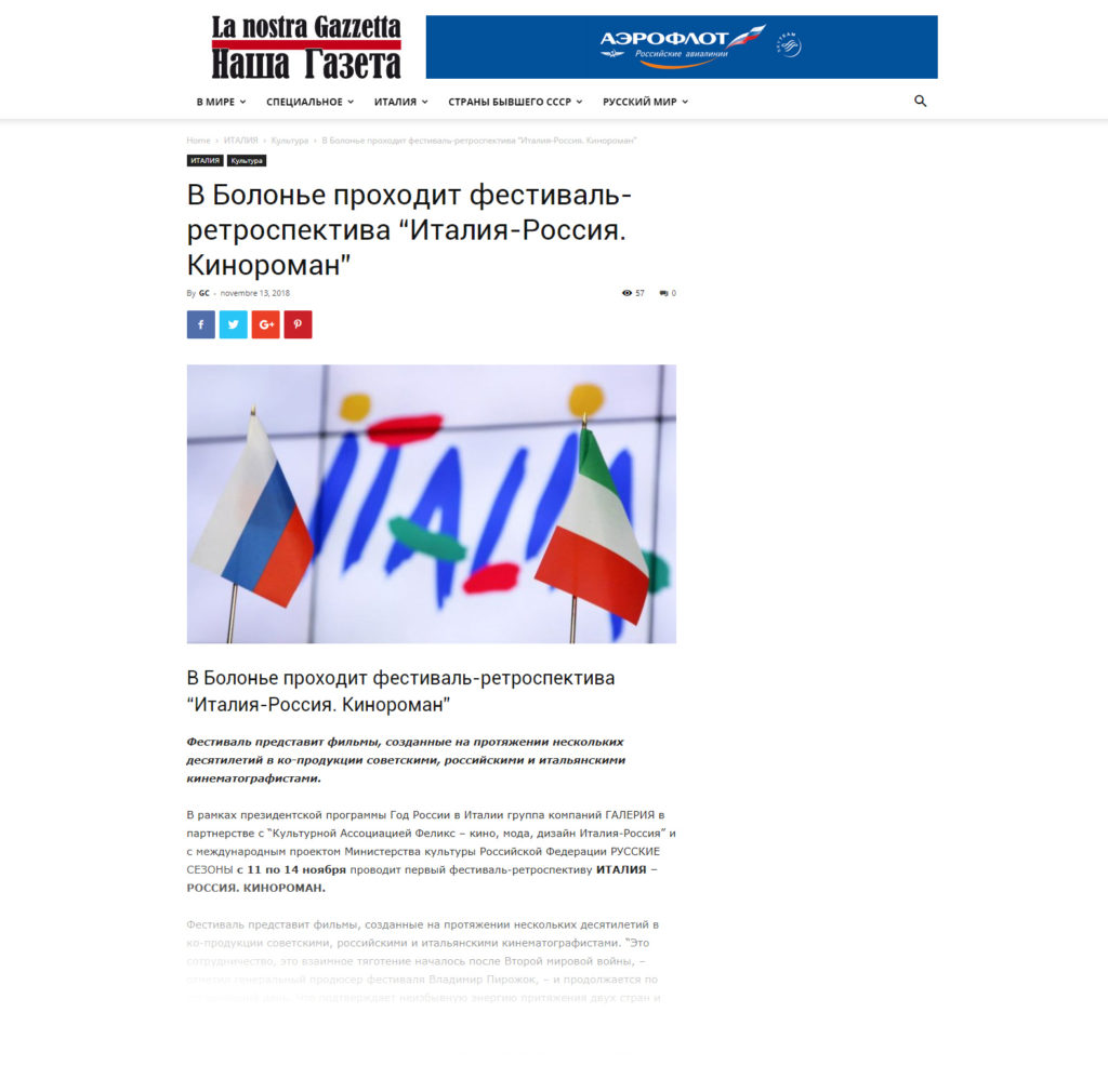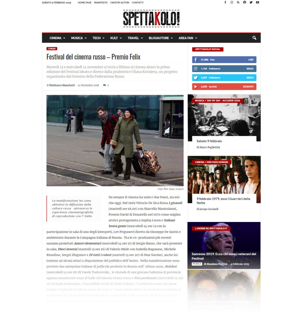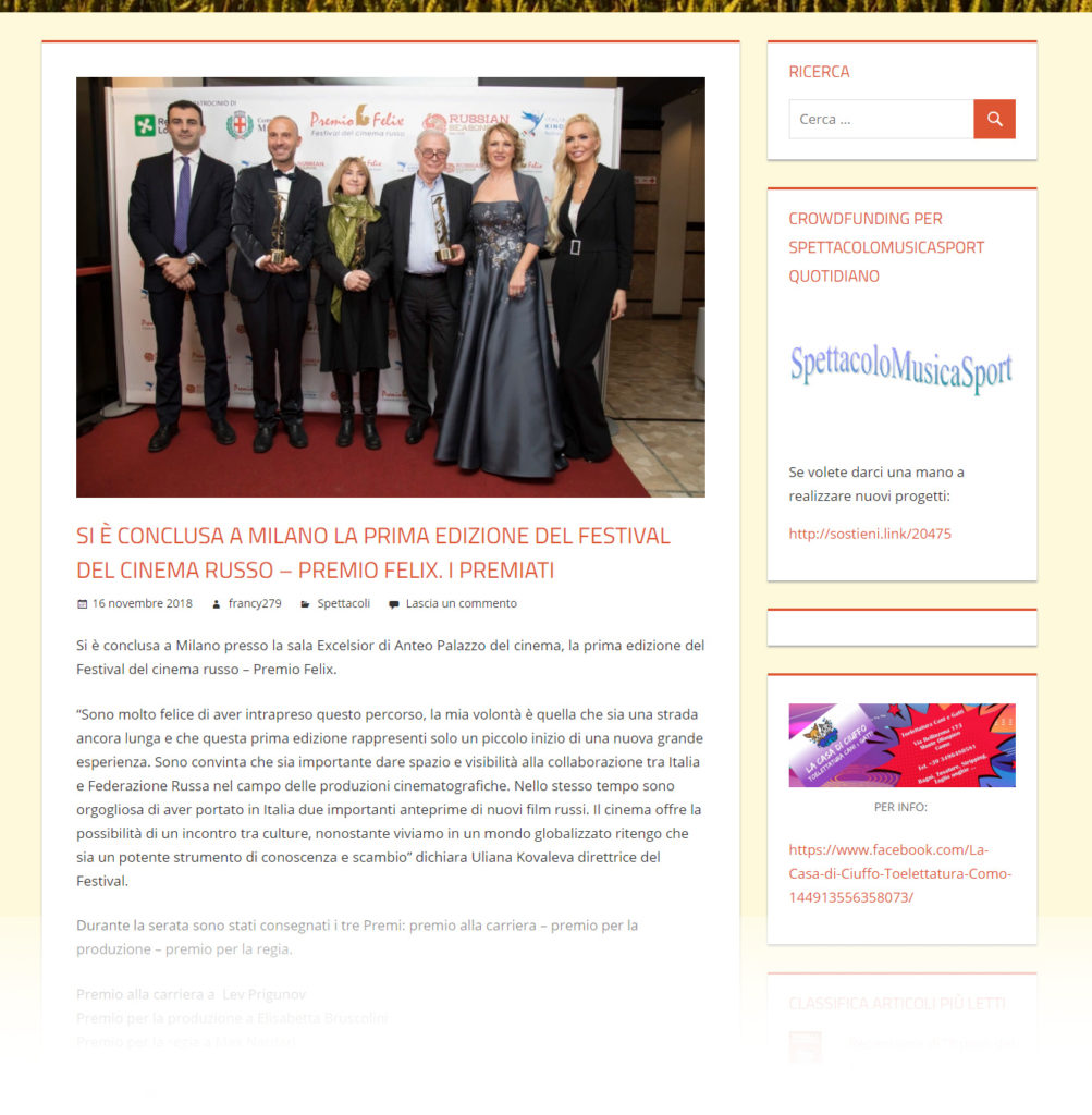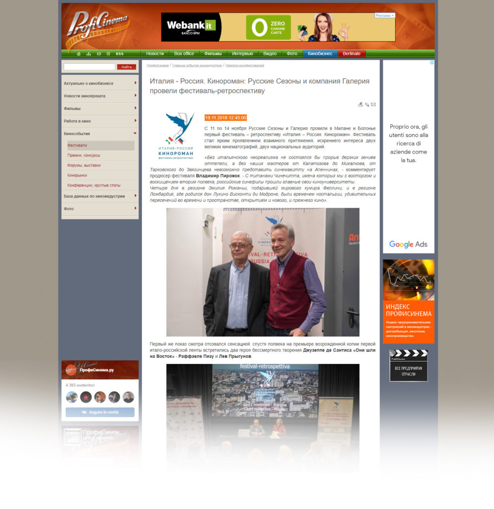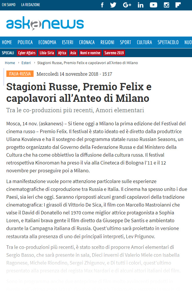 La manifestazione ha avuto sostegno da programma ministeriale “Russian Seasons” e porre particolare attenzione sulle esperienze cinematografiche tra Russia e Italia. Il cinema ha spesso unito i due Paesi, sia ieri che oggi. A Milano 14 novembre 2018 presso la sala Excelsior di Anteo Palazzo del cinema sono stati consegnati i tre Premi: Premio alla carriera – Premio per la produzione – Premio per la regia.