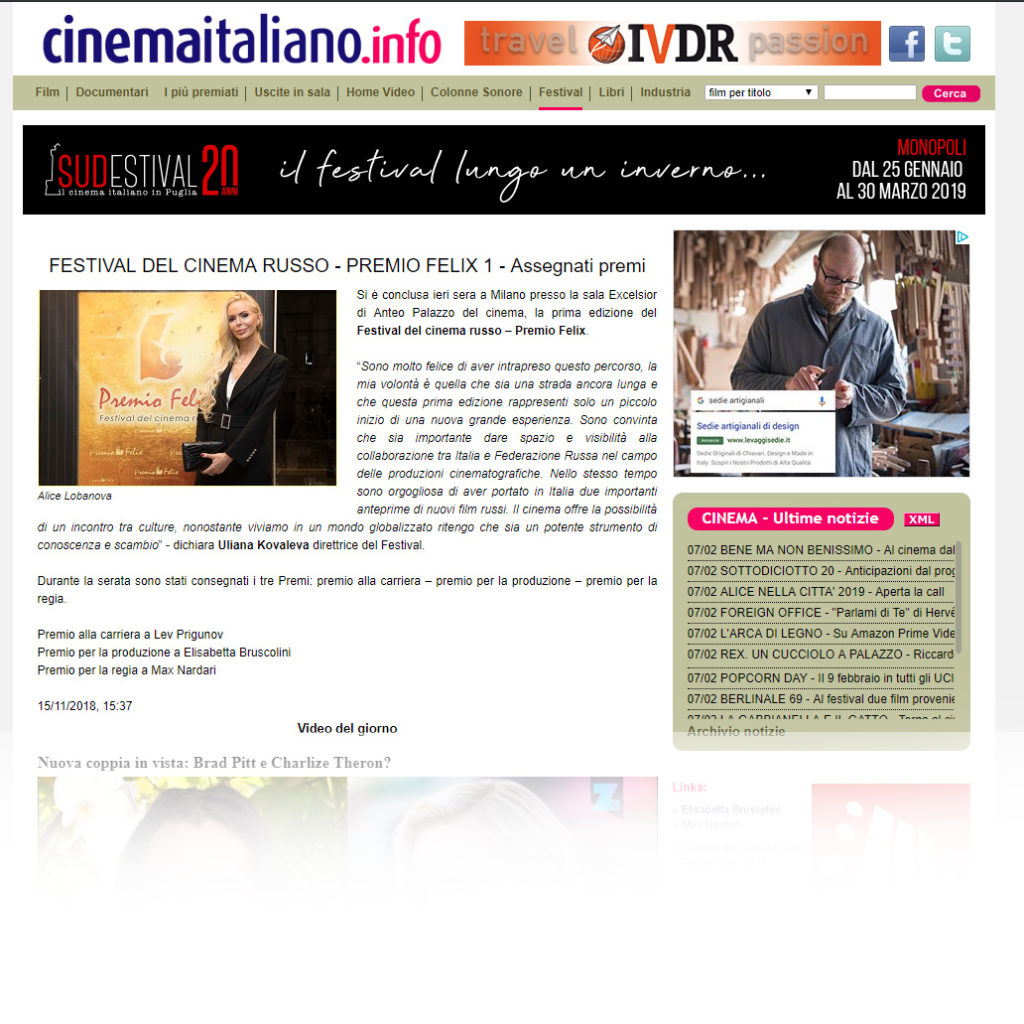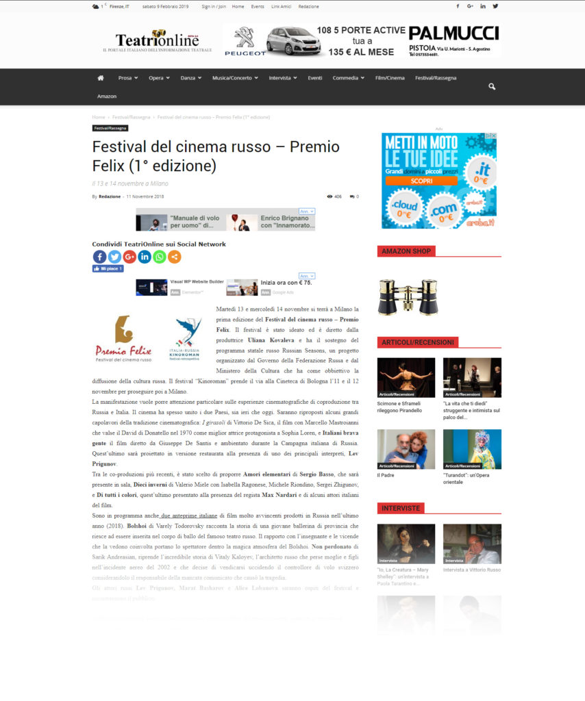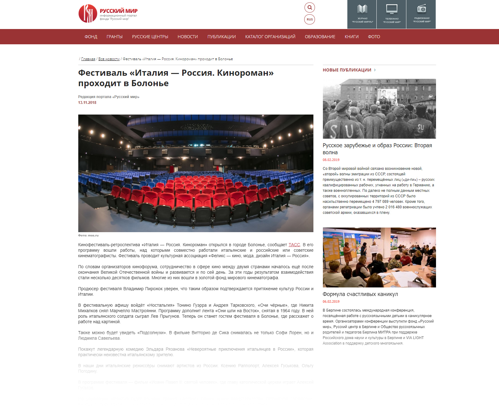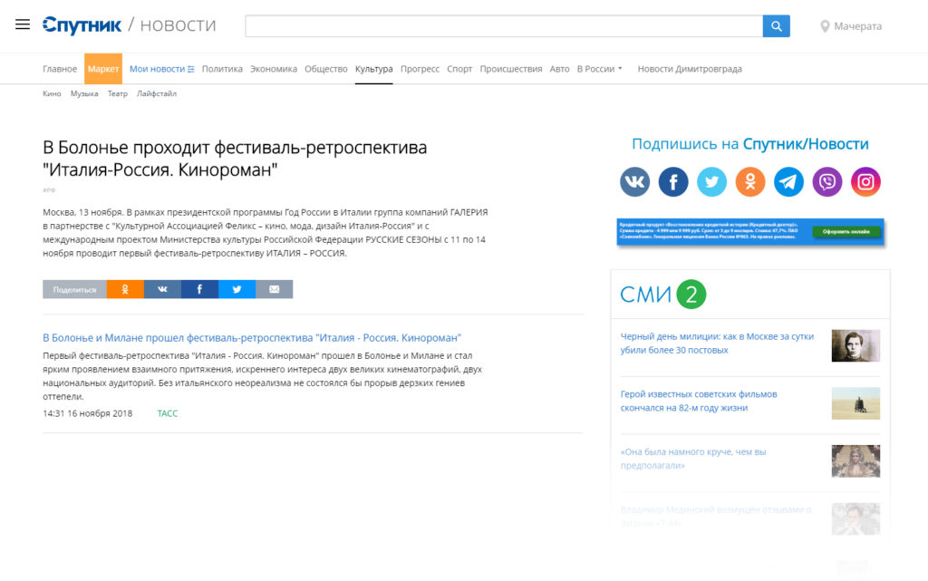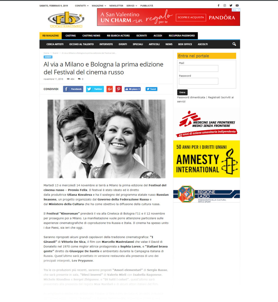 La manifestazione ha avuto sostegno da programma ministeriale “Russian Seasons” e porre particolare attenzione sulle esperienze cinematografiche tra Russia e Italia. Il cinema ha spesso unito i due Paesi, sia ieri che oggi. A Milano 14 novembre 2018 presso la sala Excelsior di Anteo Palazzo del cinema sono stati consegnati i tre Premi: Premio alla carriera – Premio per la produzione – Premio per la regia.