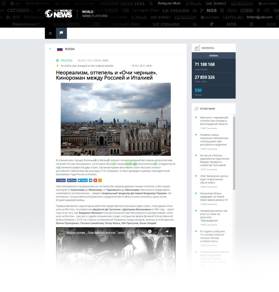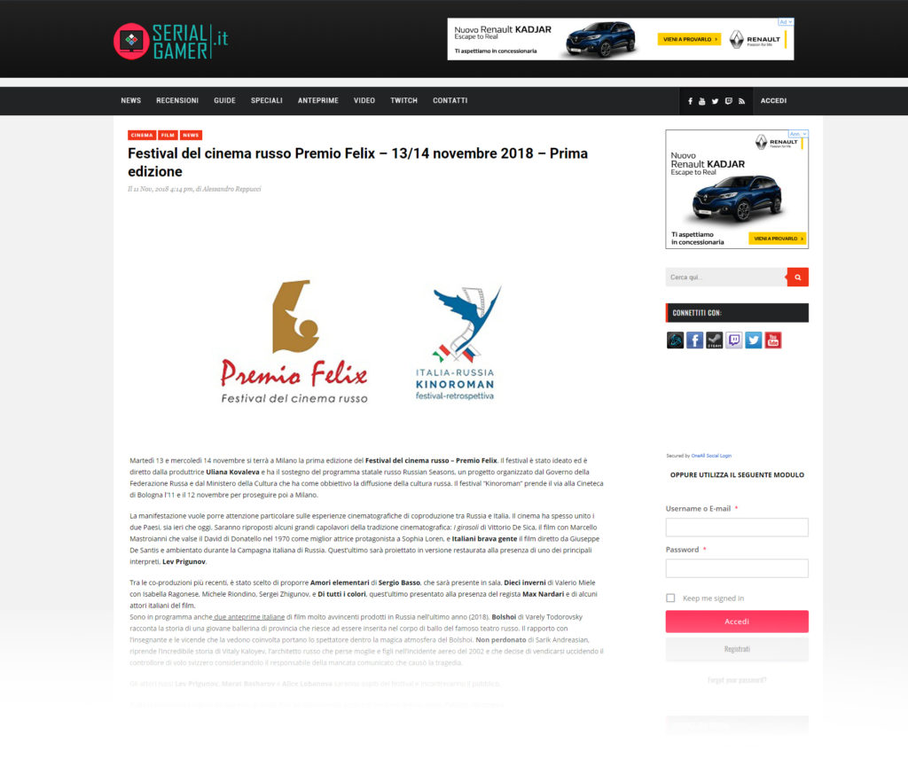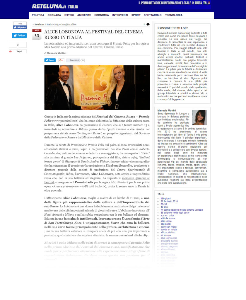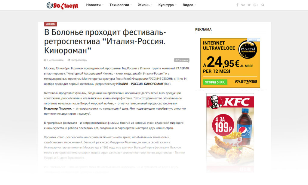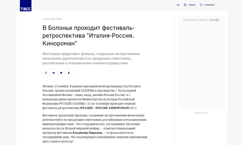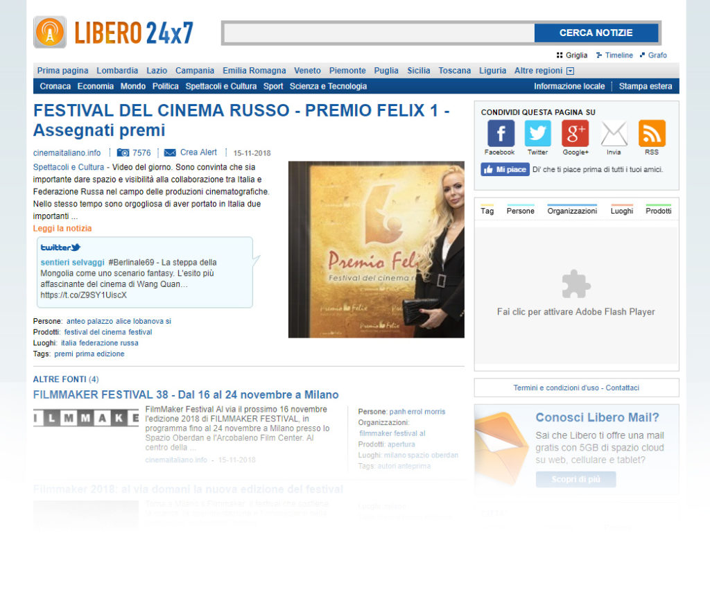 La manifestazione ha avuto sostegno da programma ministeriale “Russian Seasons” e porre particolare attenzione sulle esperienze cinematografiche tra Russia e Italia. Il cinema ha spesso unito i due Paesi, sia ieri che oggi. A Milano 14 novembre 2018 presso la sala Excelsior di Anteo Palazzo del cinema sono stati consegnati i tre Premi: Premio alla carriera – Premio per la produzione – Premio per la regia.