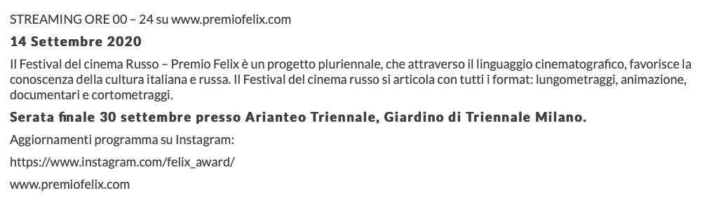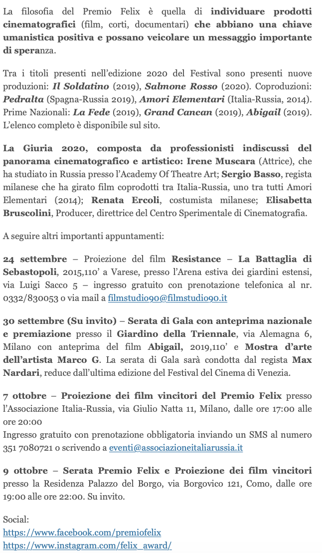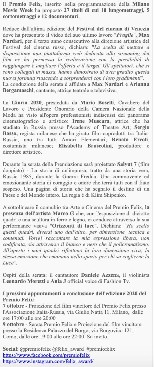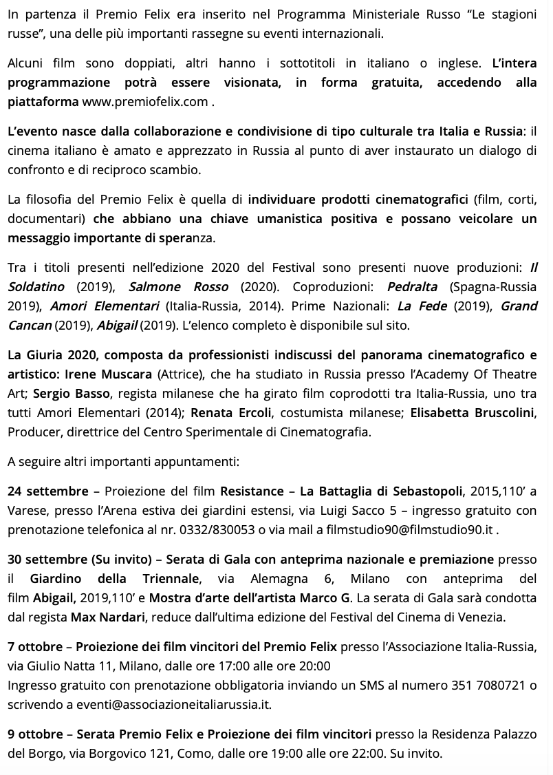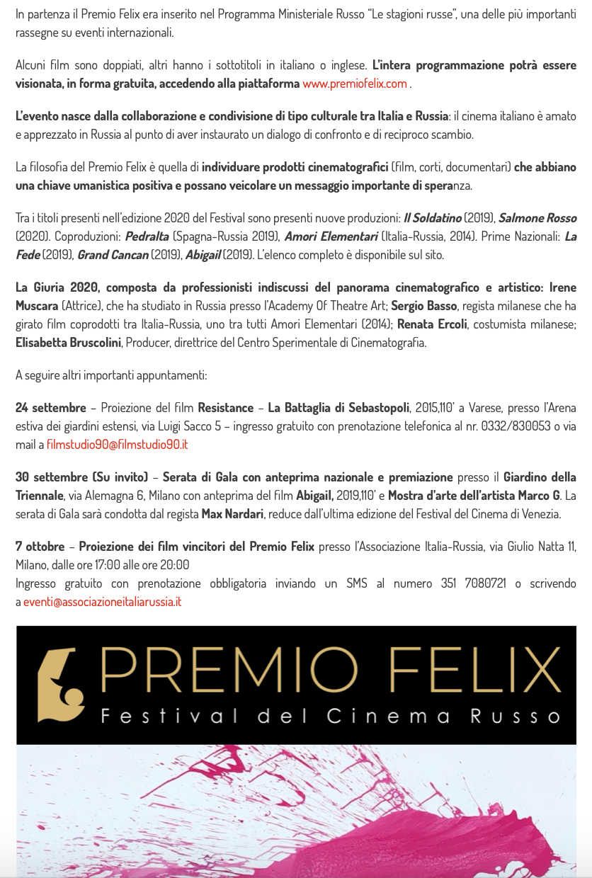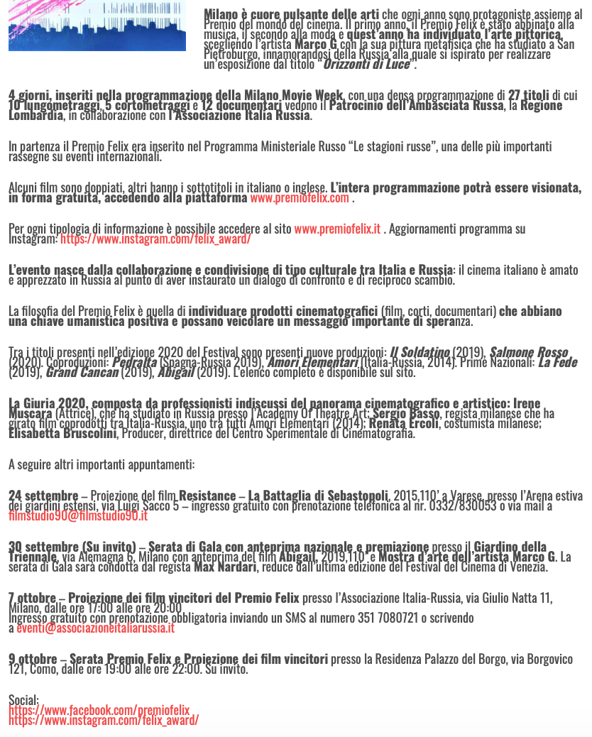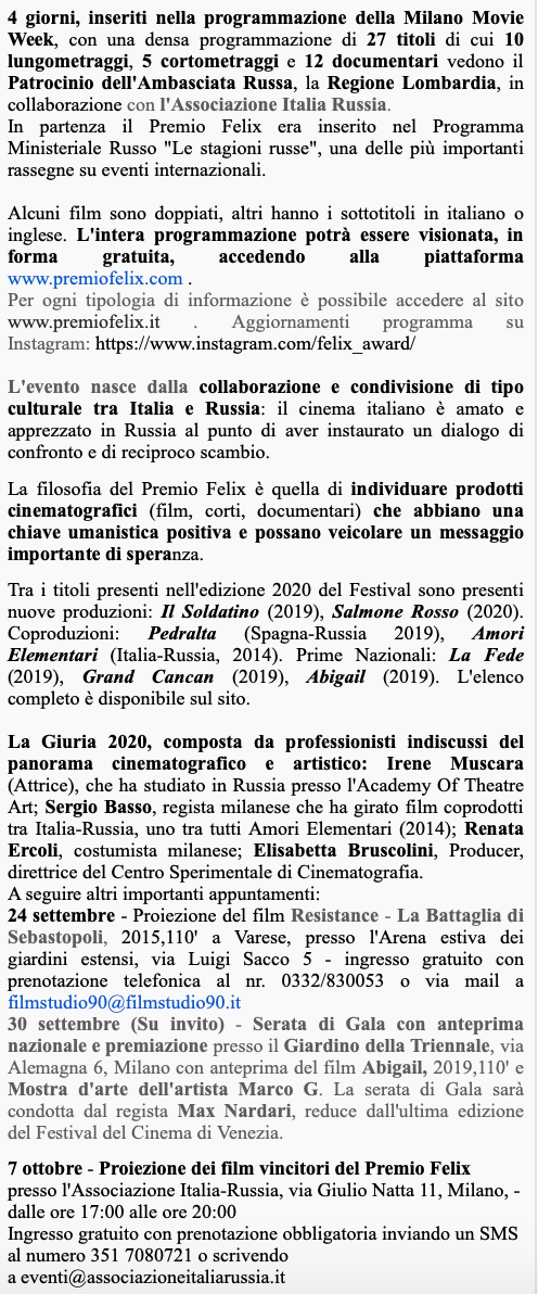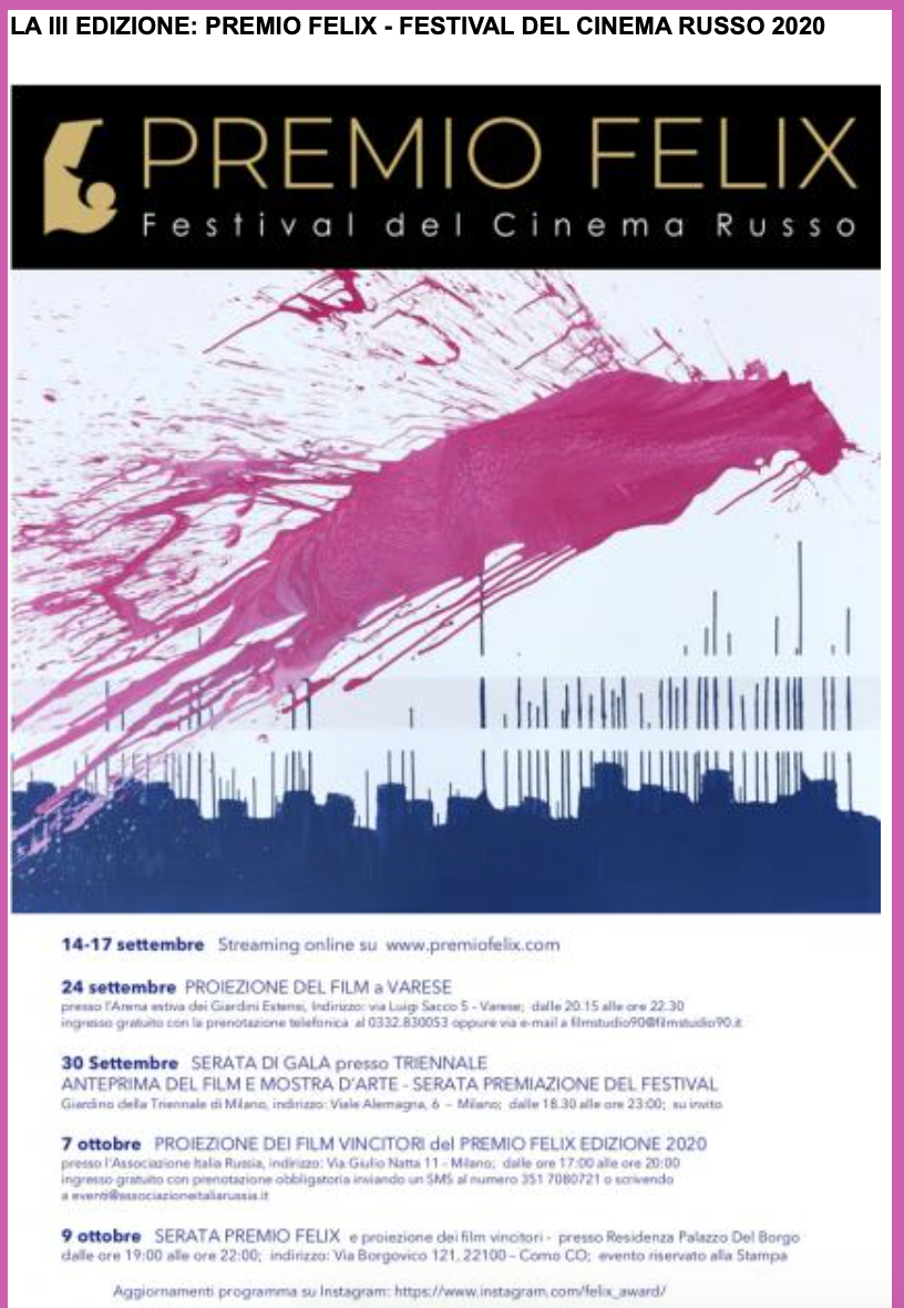 Ежегодный кинофестиваль провели итало-российская Культурная Ассоциация Феликс – кино, мода, дизайн и Ассоциация Италия-Россия под патронатом Посольства Российской Федерации в Италии и региона Ломбардия. Кинофестиваль входит официальную программу Milano Movie Week.
