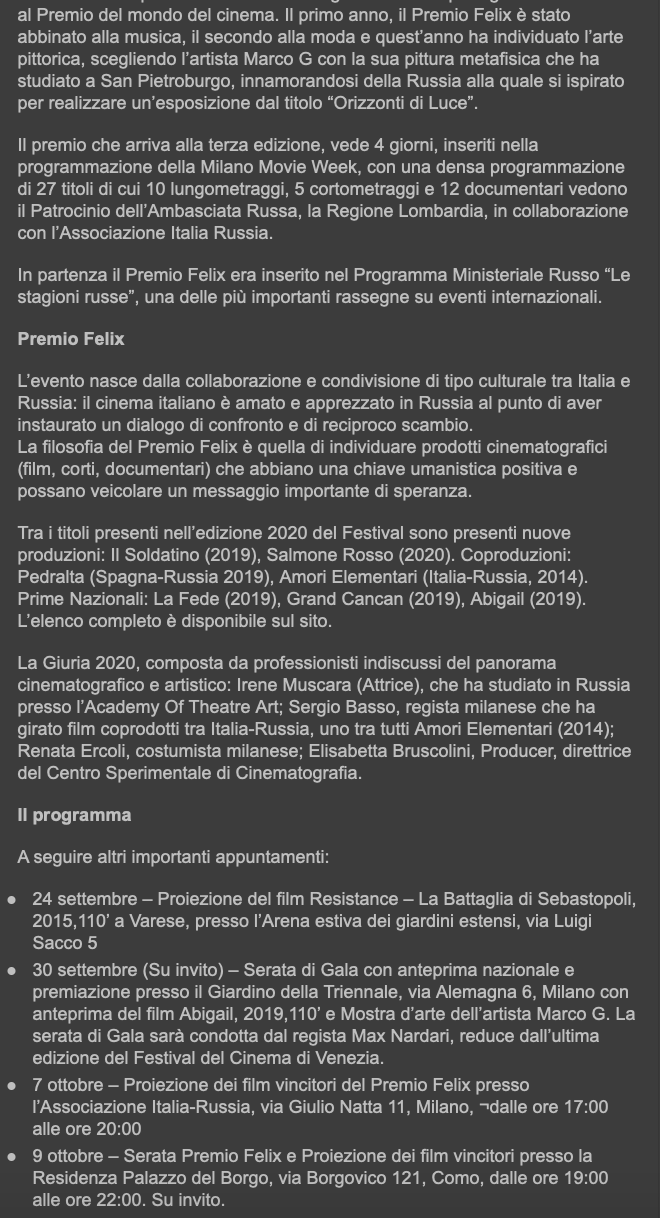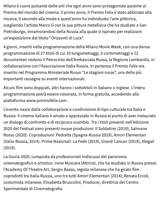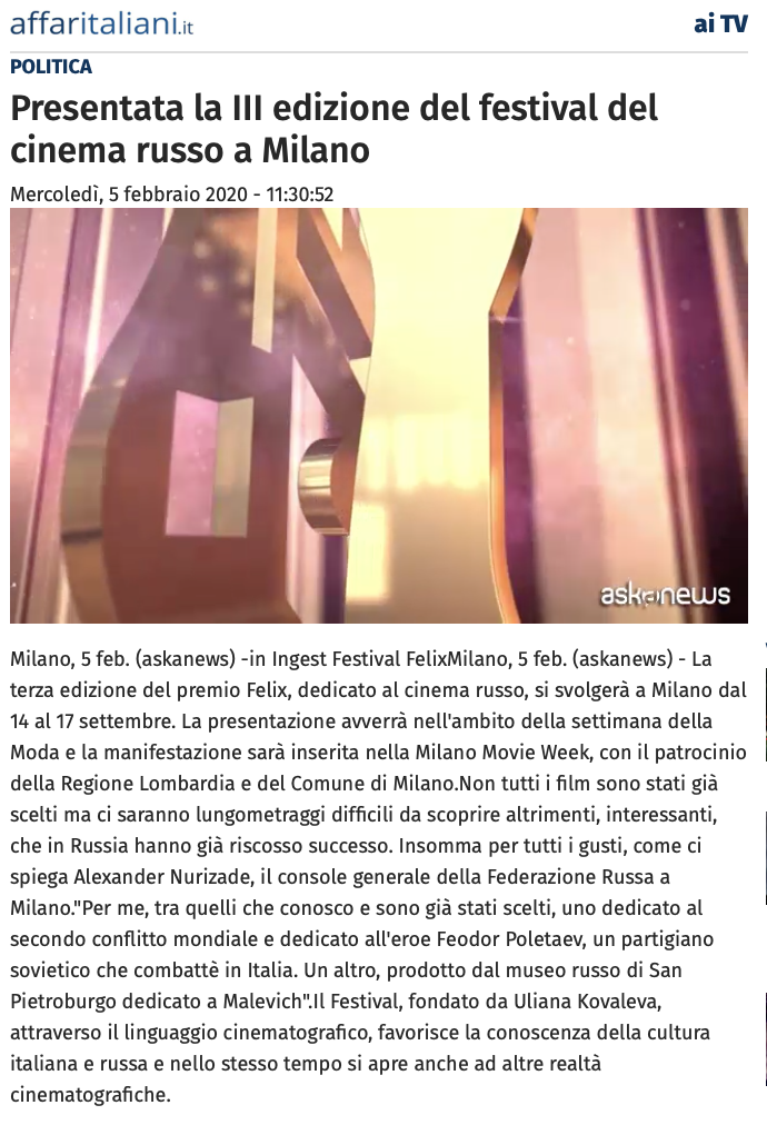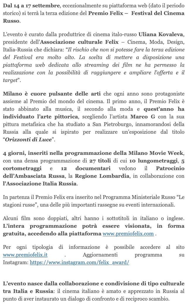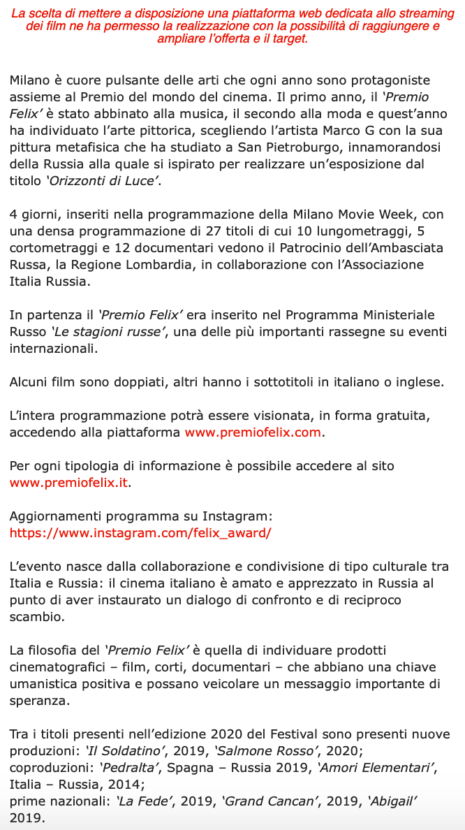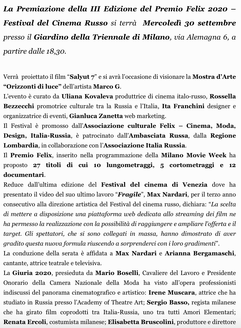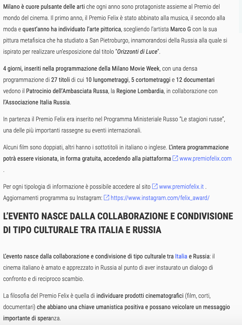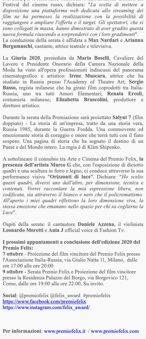Ежегодный кинофестиваль провели итало-российская Культурная Ассоциация Феликс – кино, мода, дизайн и Ассоциация Италия-Россия под патронатом Посольства Российской Федерации в Италии и региона Ломбардия. Кинофестиваль входит официальную программу Milano Movie Week.