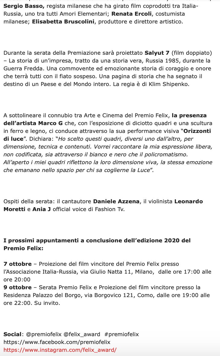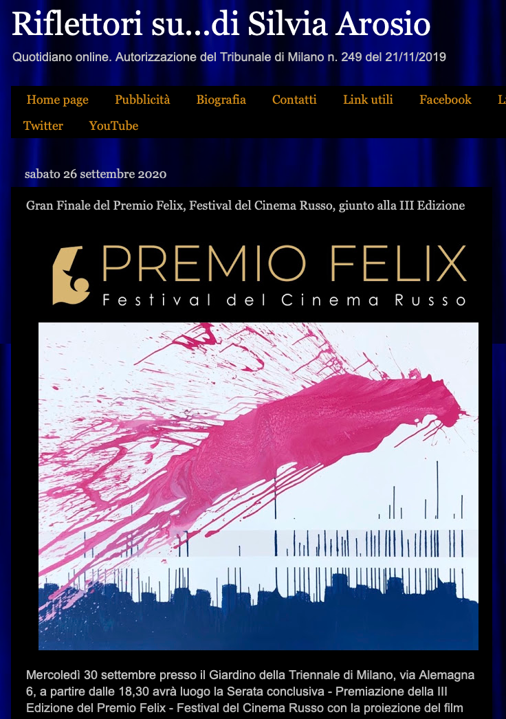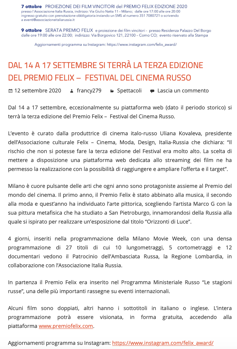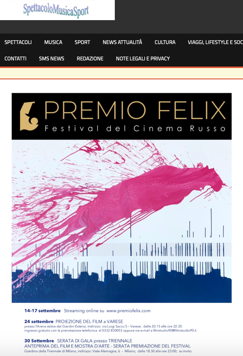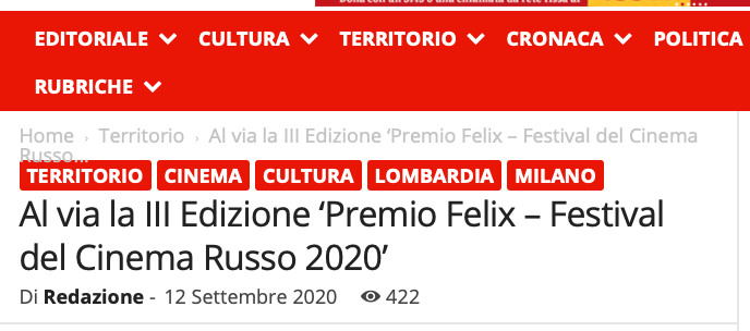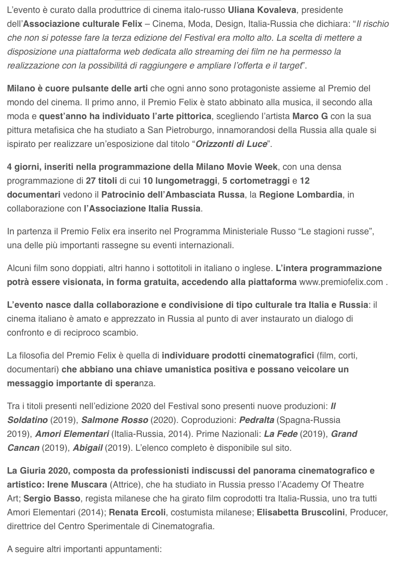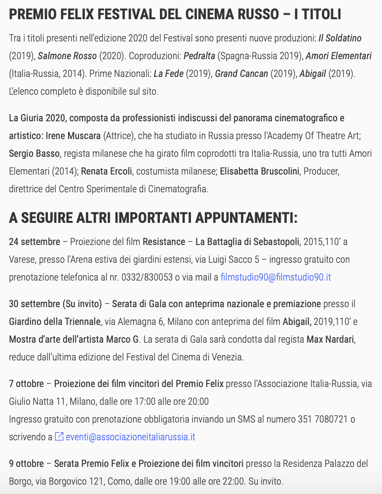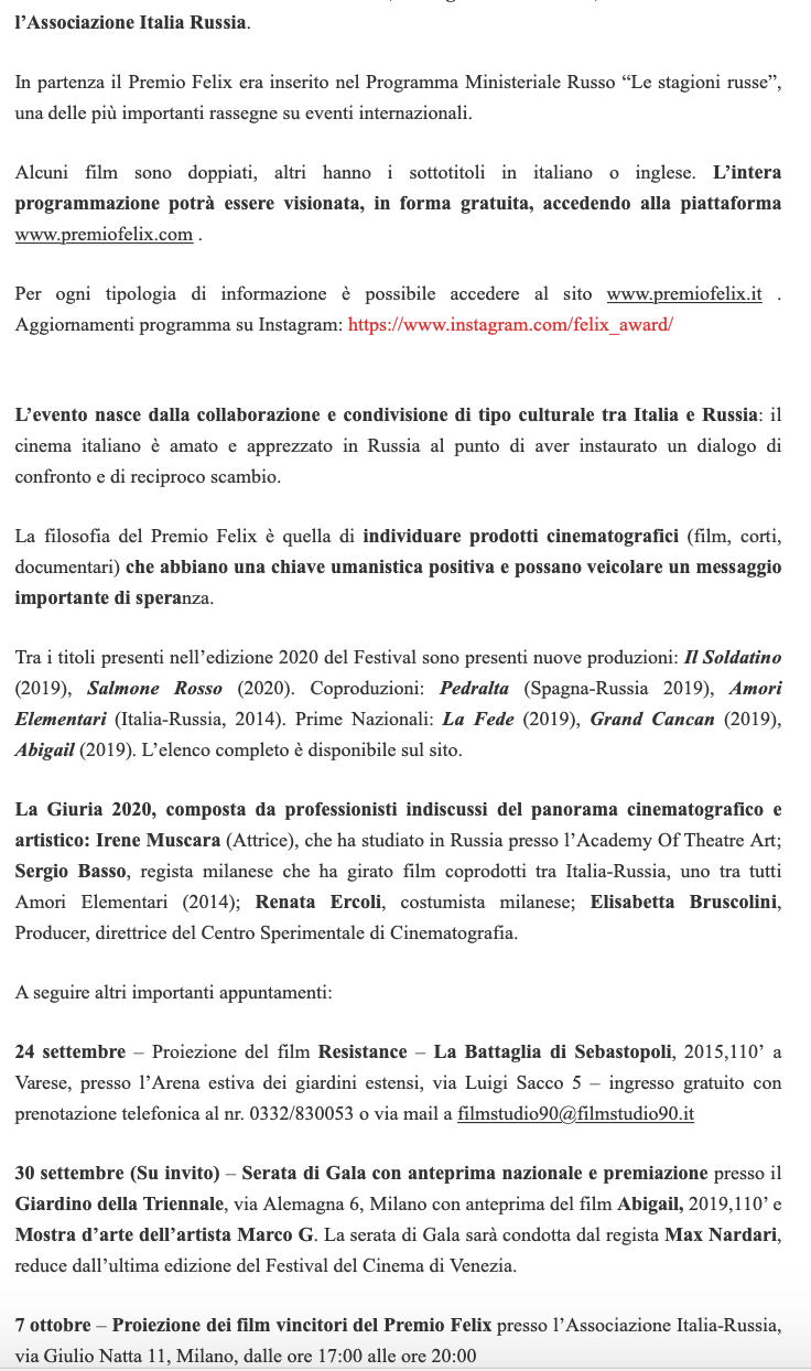 Ежегодный кинофестиваль провели итало-российская Культурная Ассоциация Феликс – кино, мода, дизайн и Ассоциация Италия-Россия под патронатом Посольства Российской Федерации в Италии и региона Ломбардия. Кинофестиваль входит официальную программу Milano Movie Week.