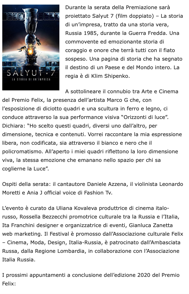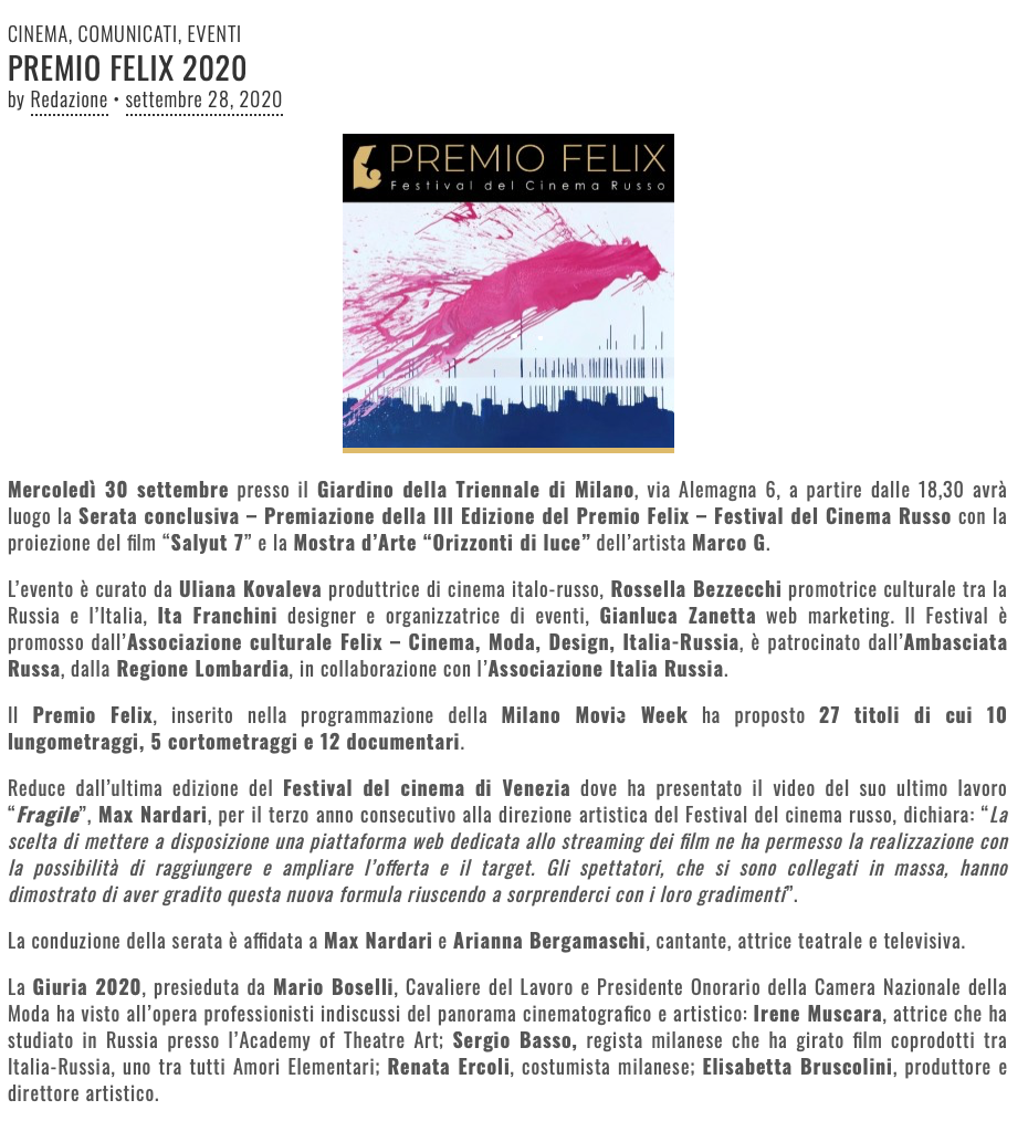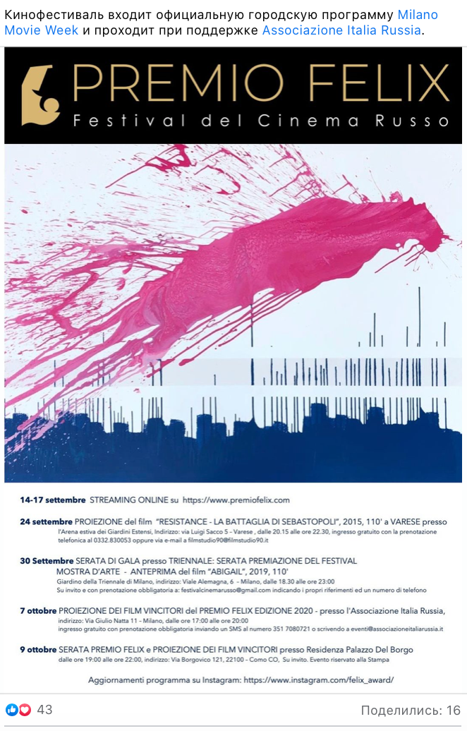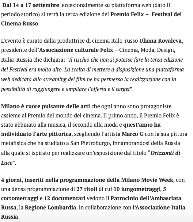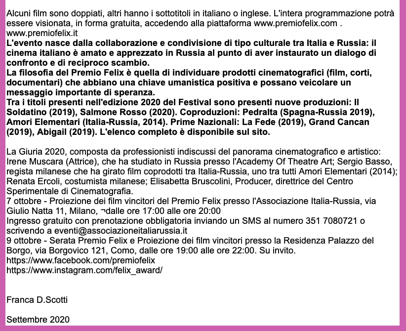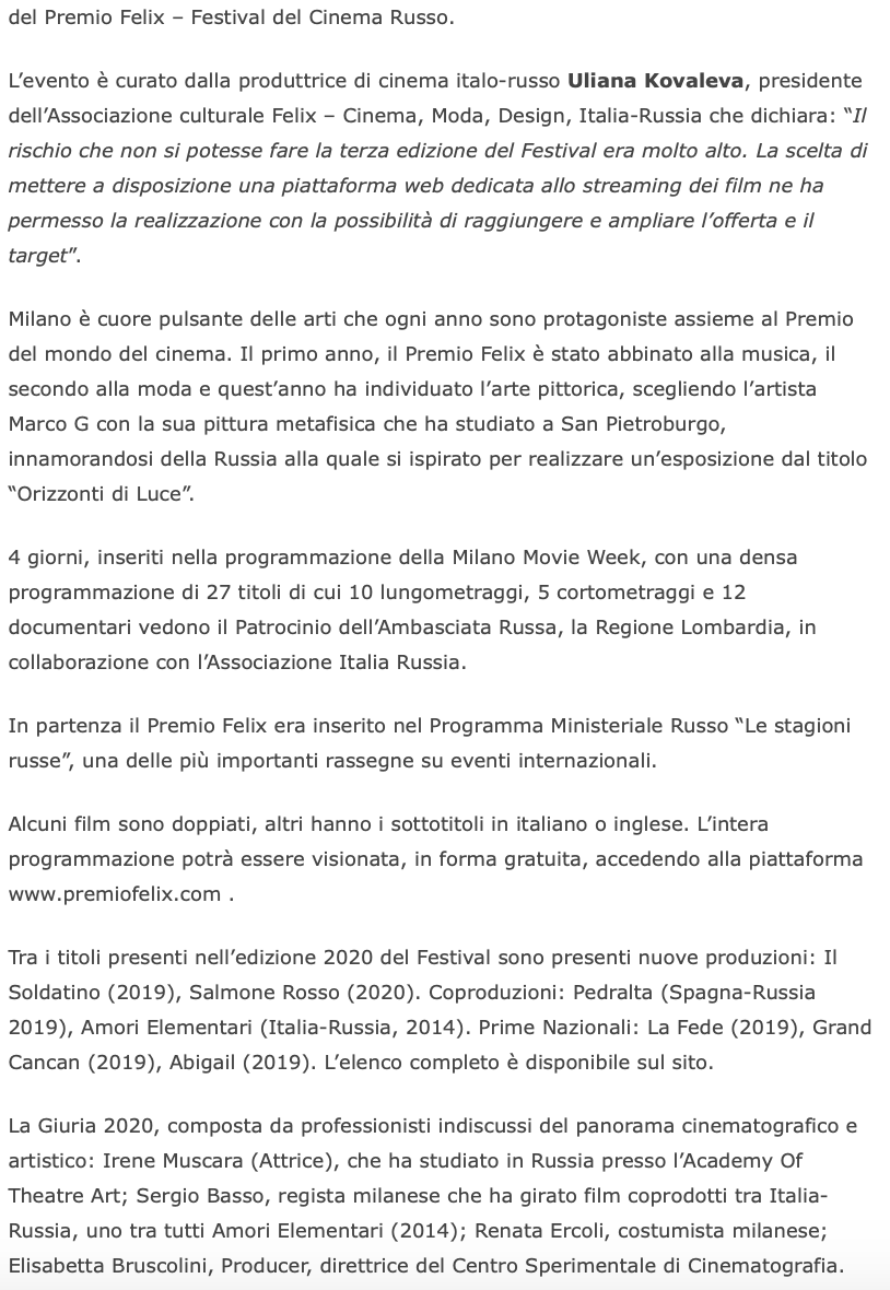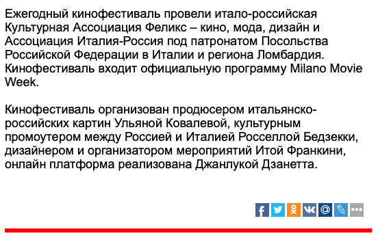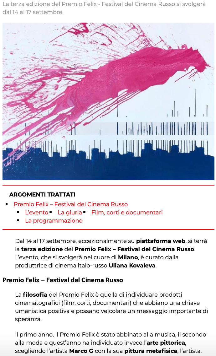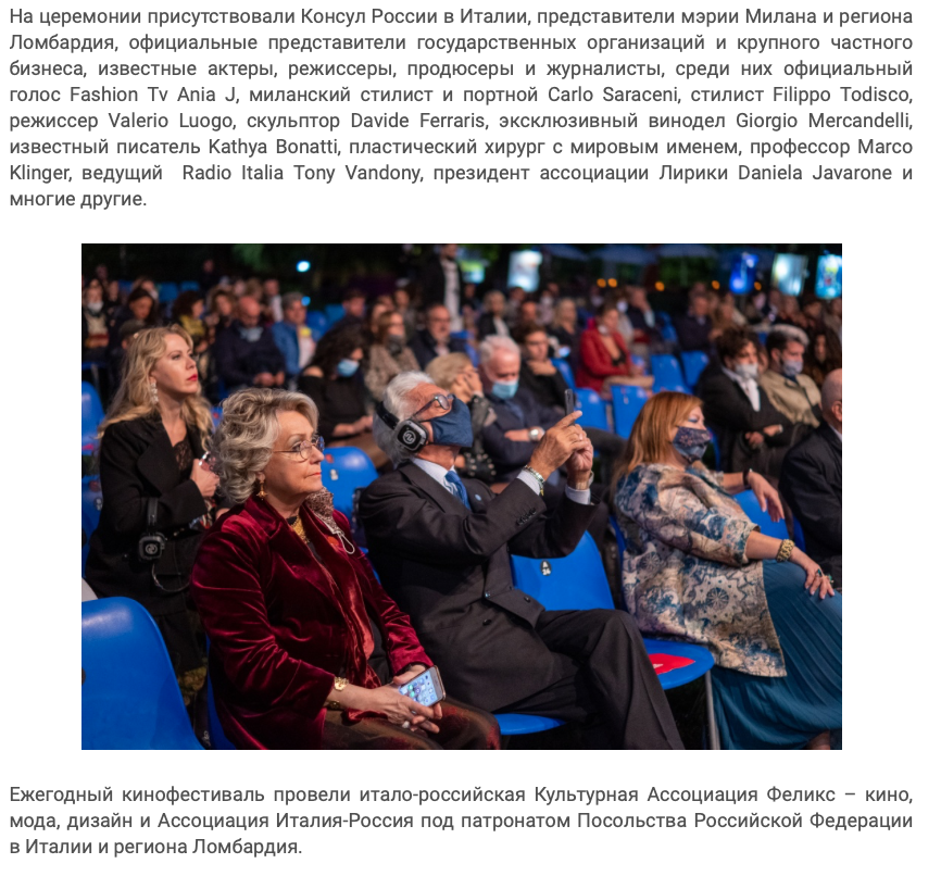 Ежегодный кинофестиваль провели итало-российская Культурная Ассоциация Феликс – кино, мода, дизайн и Ассоциация Италия-Россия под патронатом Посольства Российской Федерации в Италии и региона Ломбардия. Кинофестиваль входит официальную программу Milano Movie Week.