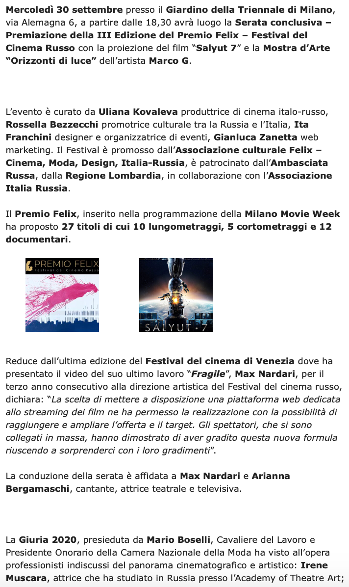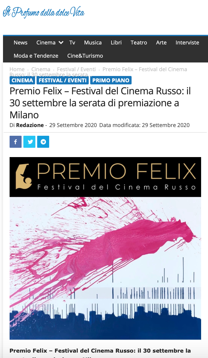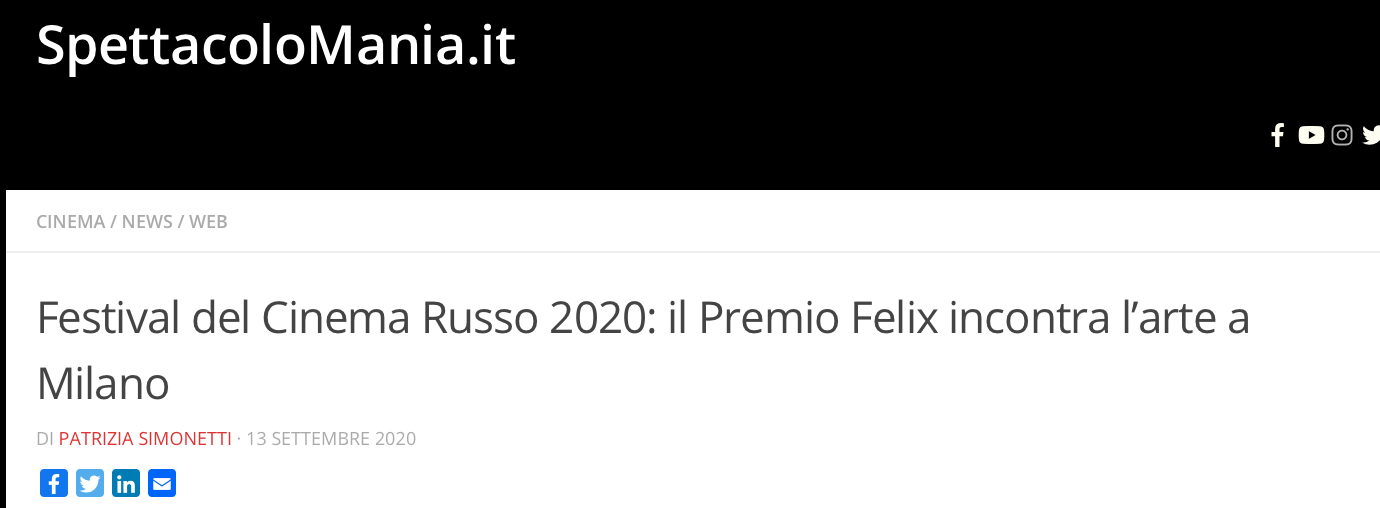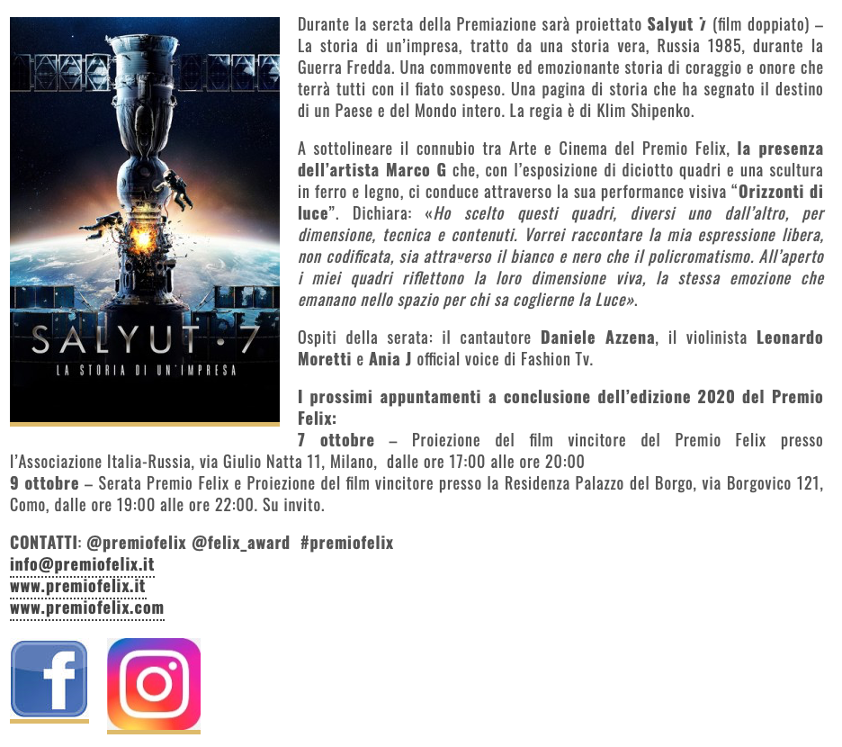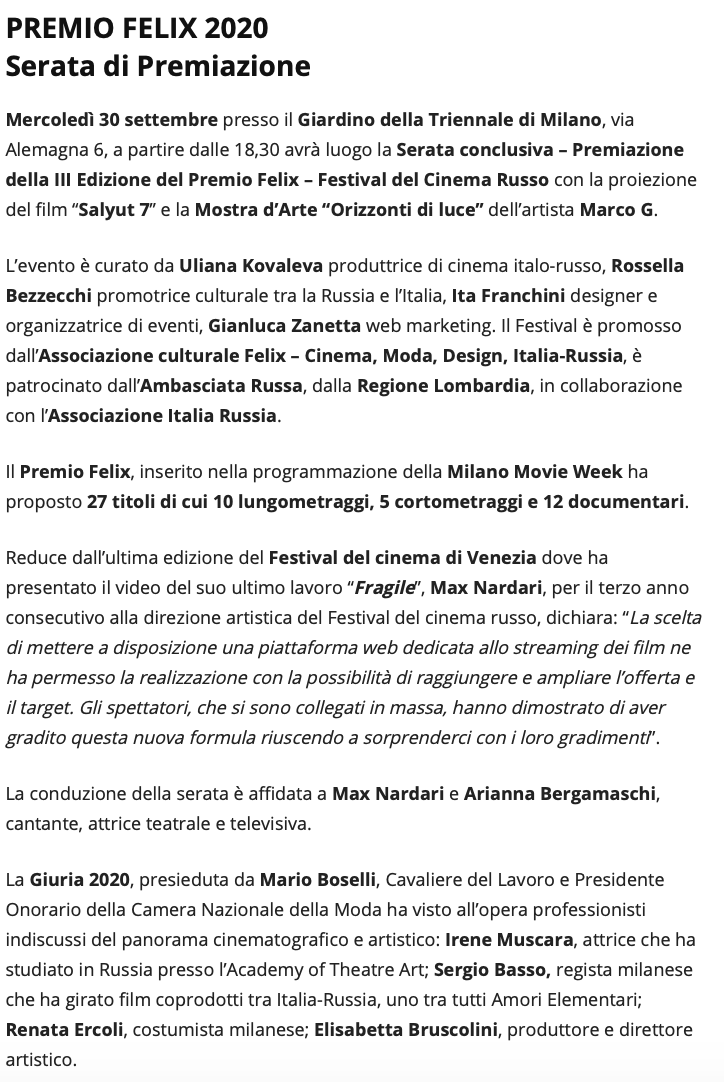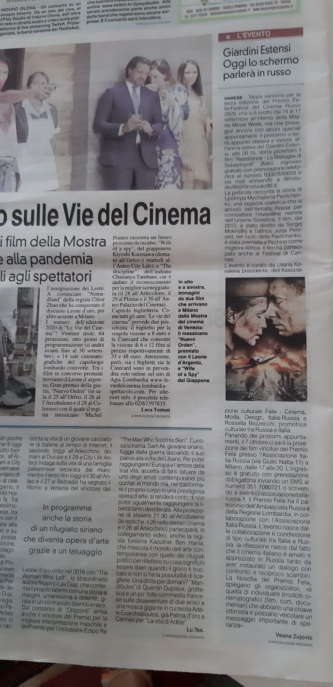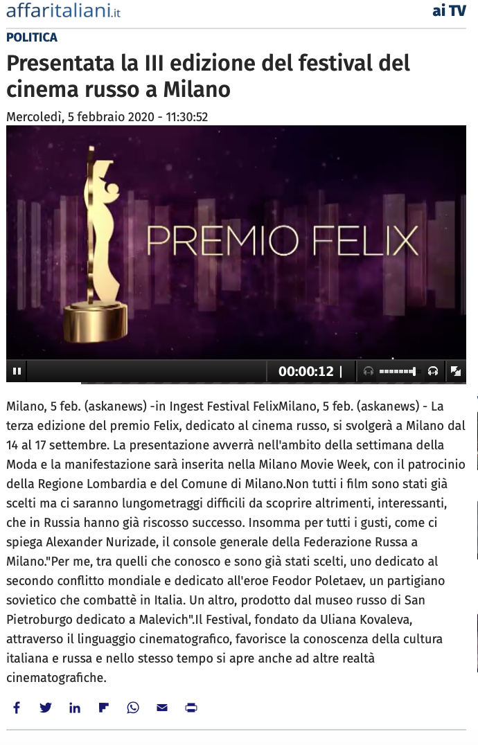 Ежегодный кинофестиваль провели итало-российская Культурная Ассоциация Феликс – кино, мода, дизайн и Ассоциация Италия-Россия под патронатом Посольства Российской Федерации в Италии и региона Ломбардия. Кинофестиваль входит официальную программу Milano Movie Week.