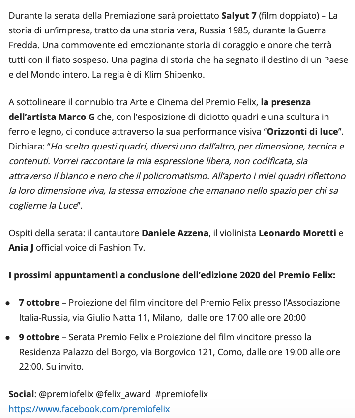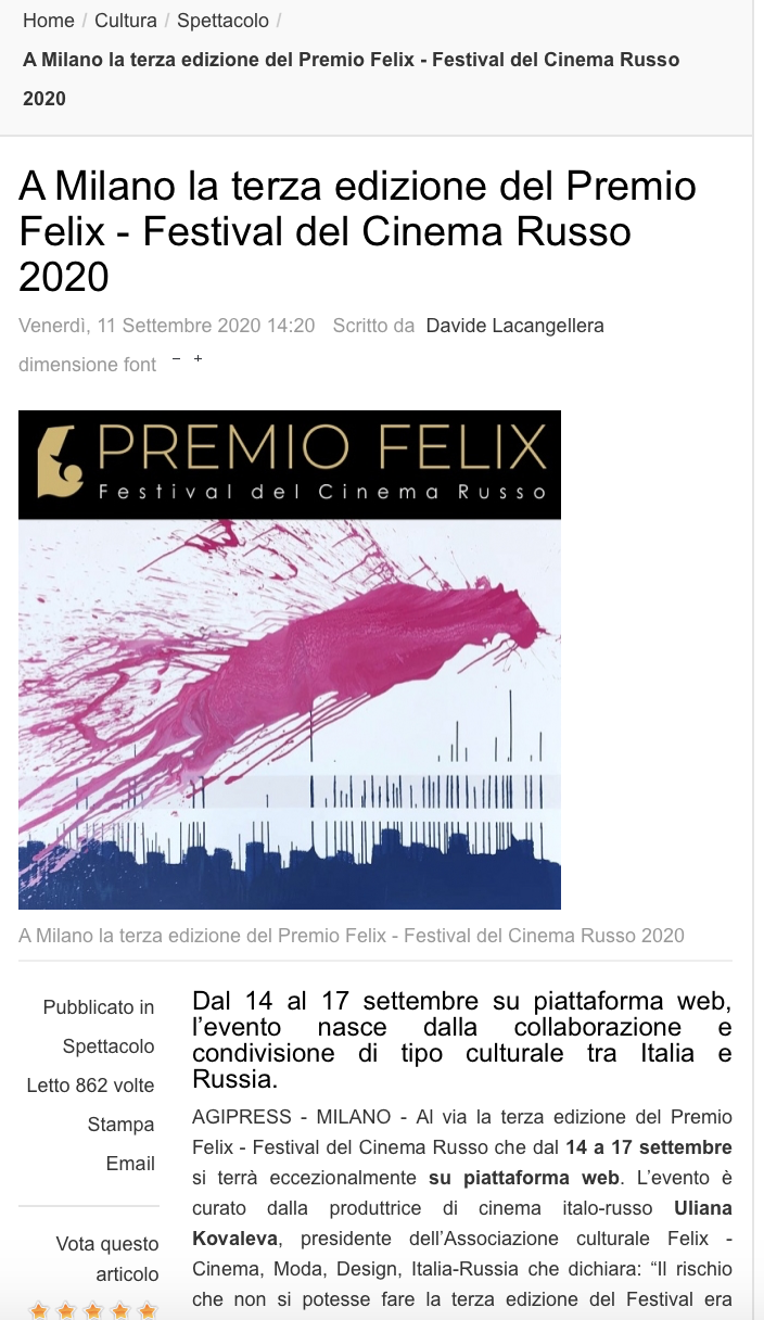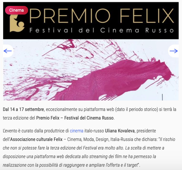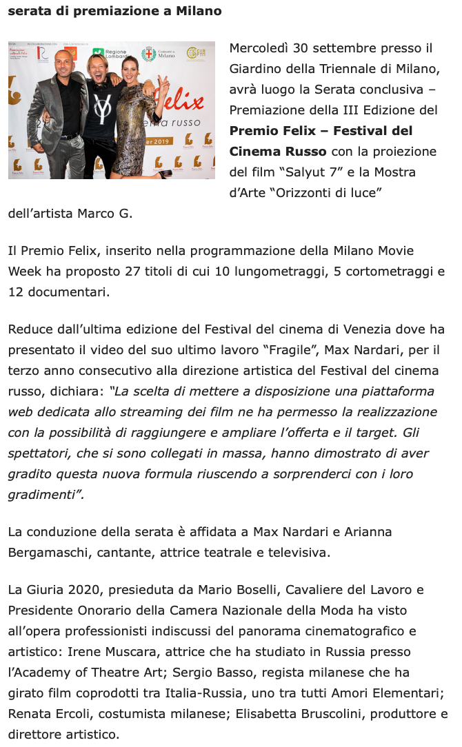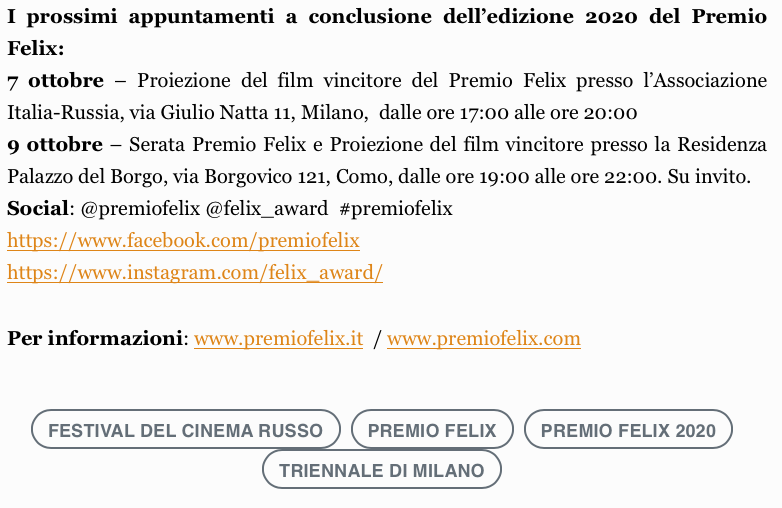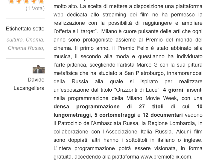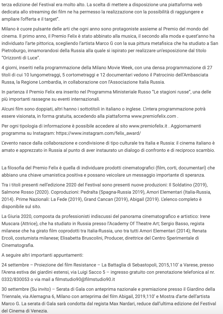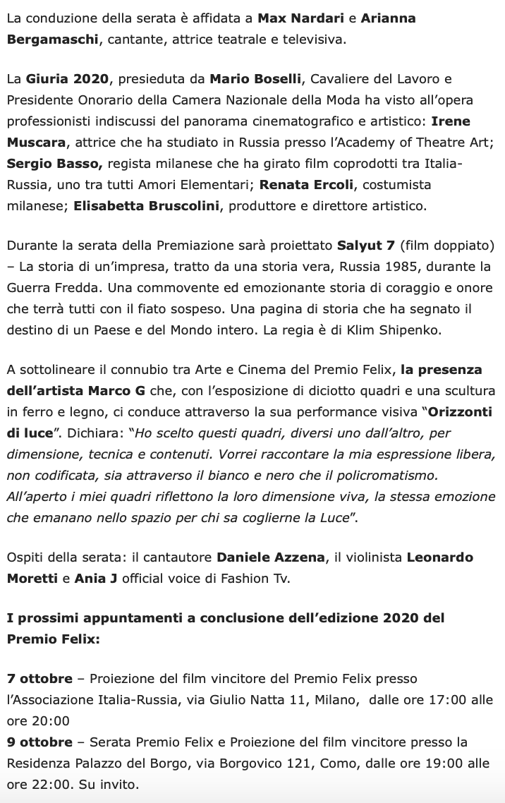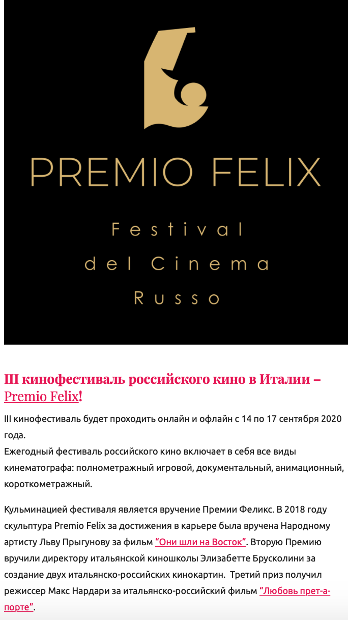 Ежегодный кинофестиваль провели итало-российская Культурная Ассоциация Феликс – кино, мода, дизайн и Ассоциация Италия-Россия под патронатом Посольства Российской Федерации в Италии и региона Ломбардия. Кинофестиваль входит официальную программу Milano Movie Week.