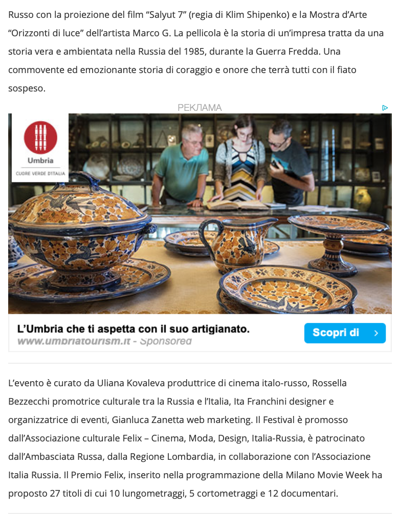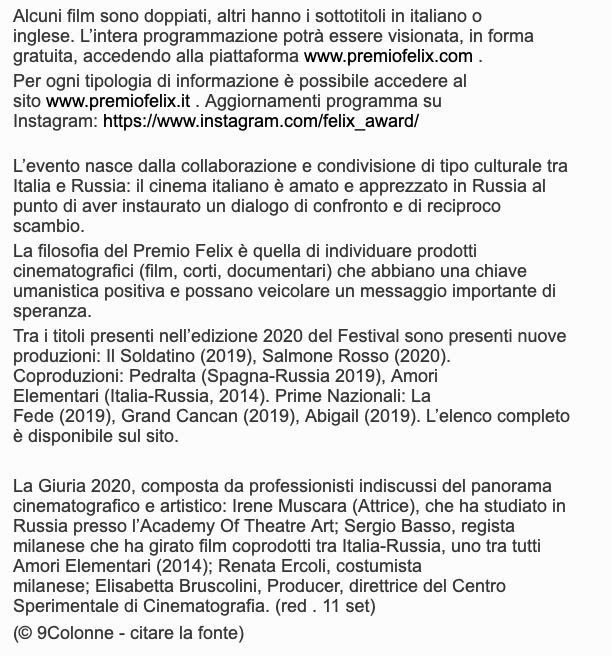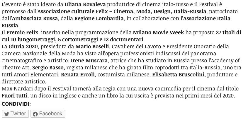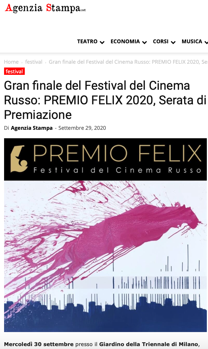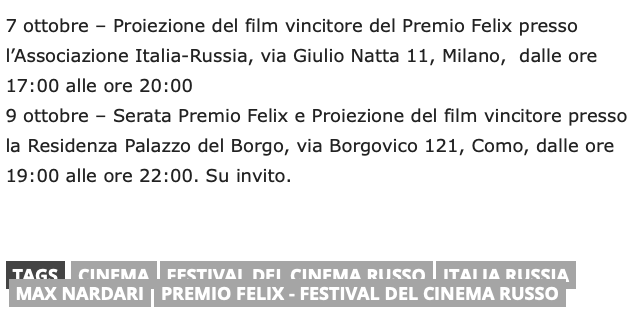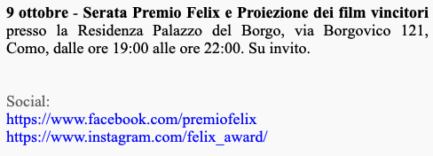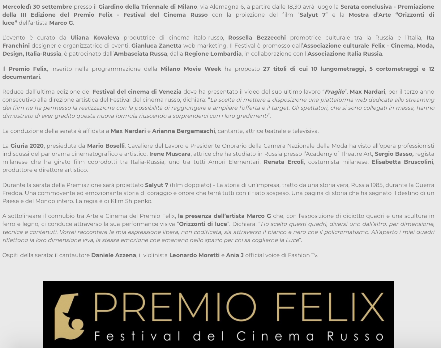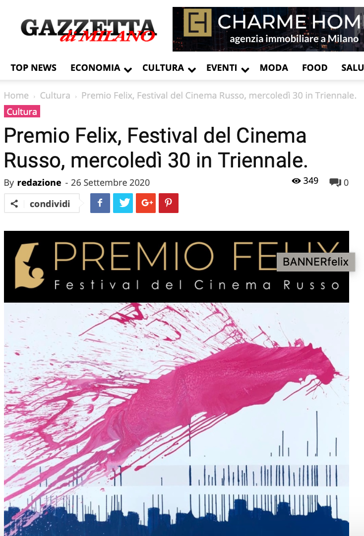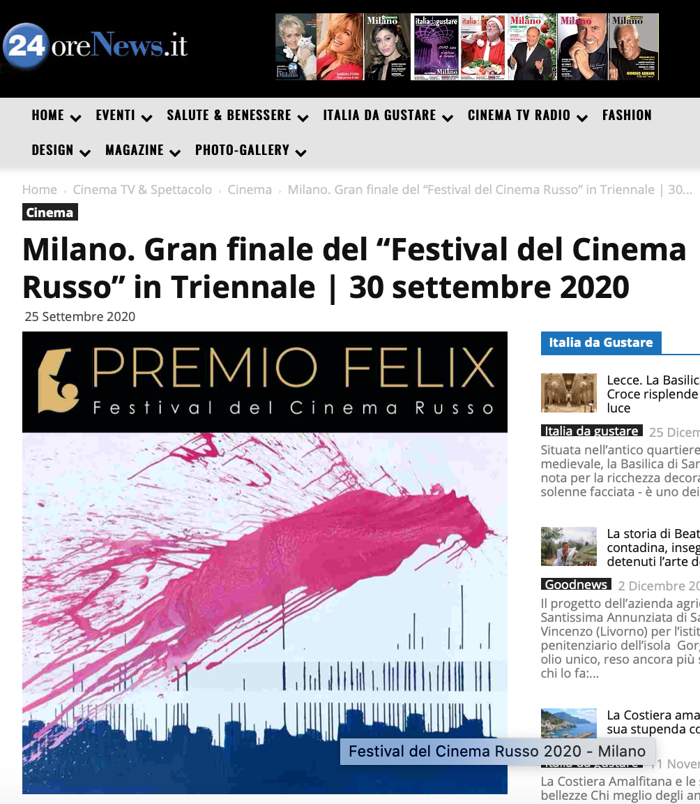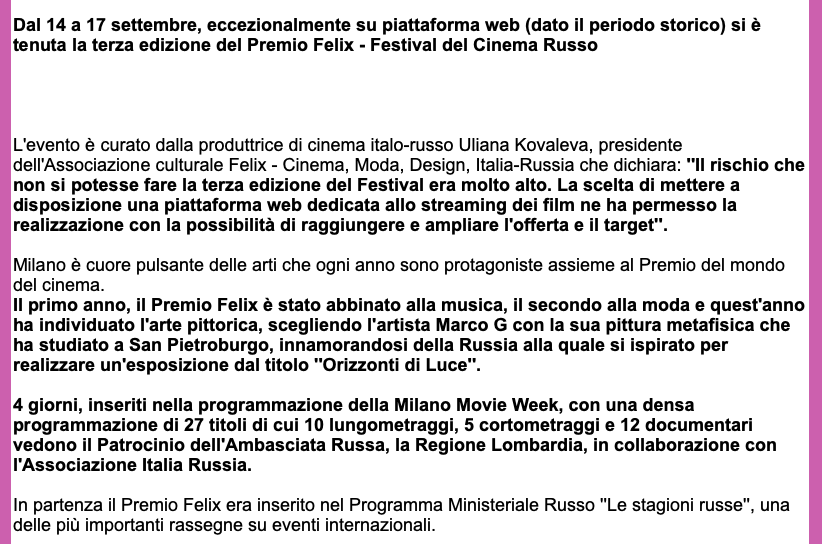 Ежегодный кинофестиваль провели итало-российская Культурная Ассоциация Феликс – кино, мода, дизайн и Ассоциация Италия-Россия под патронатом Посольства Российской Федерации в Италии и региона Ломбардия. Кинофестиваль входит официальную программу Milano Movie Week.
