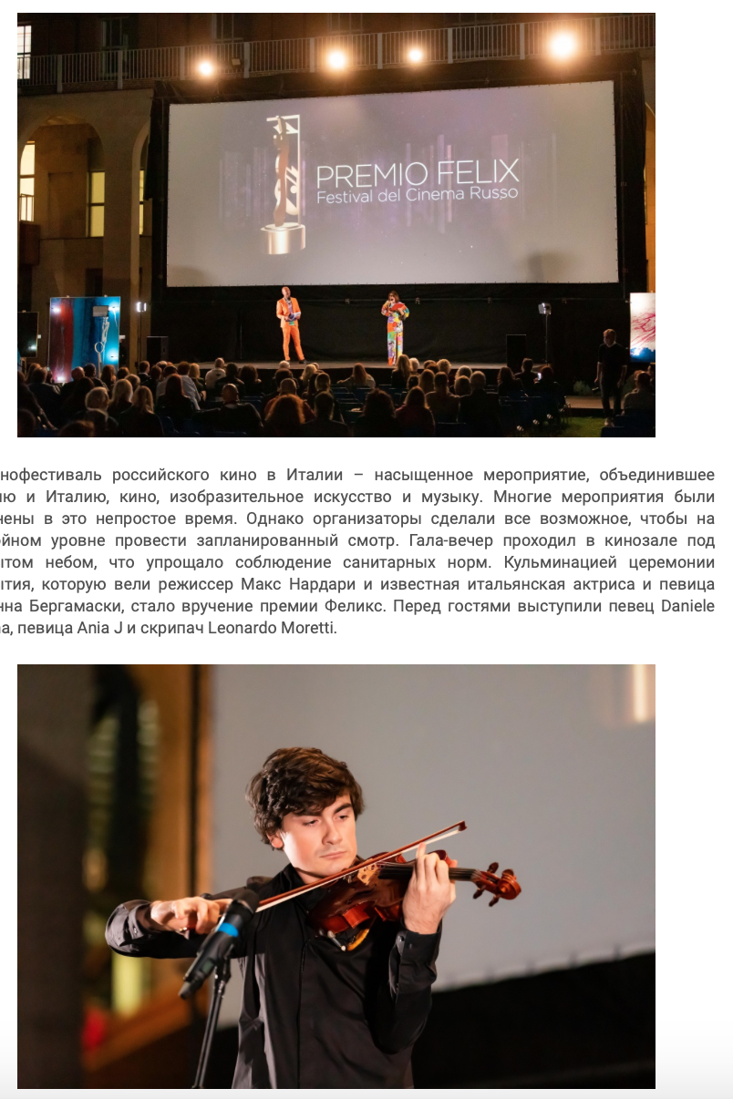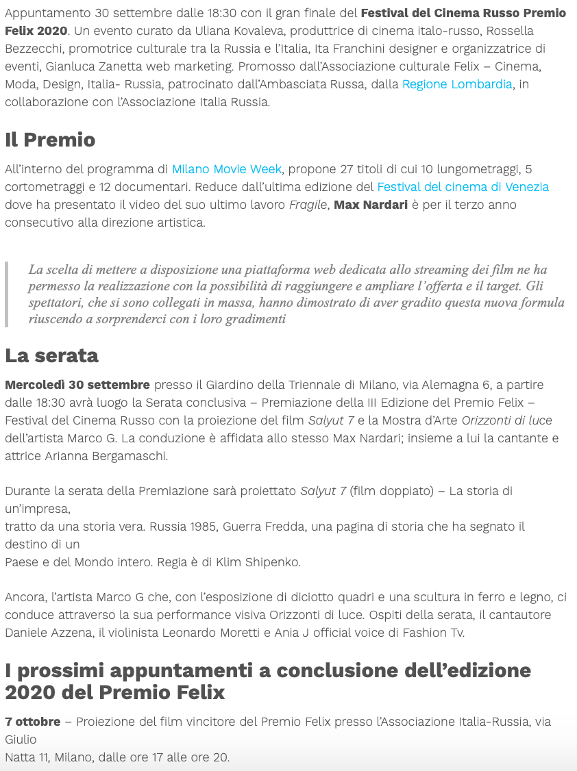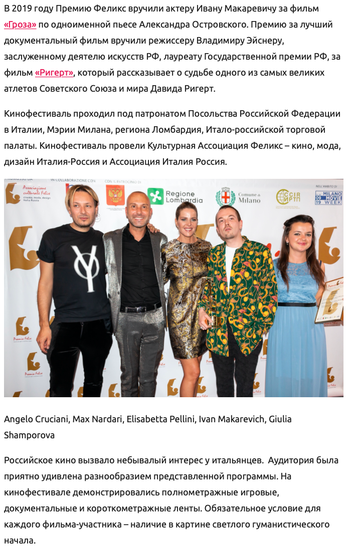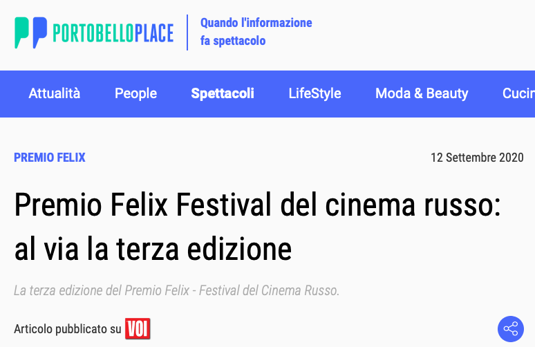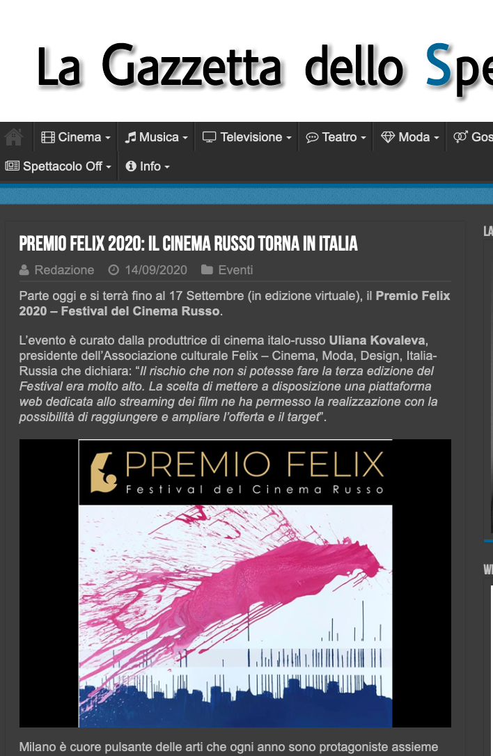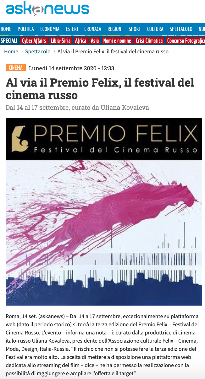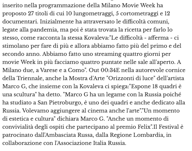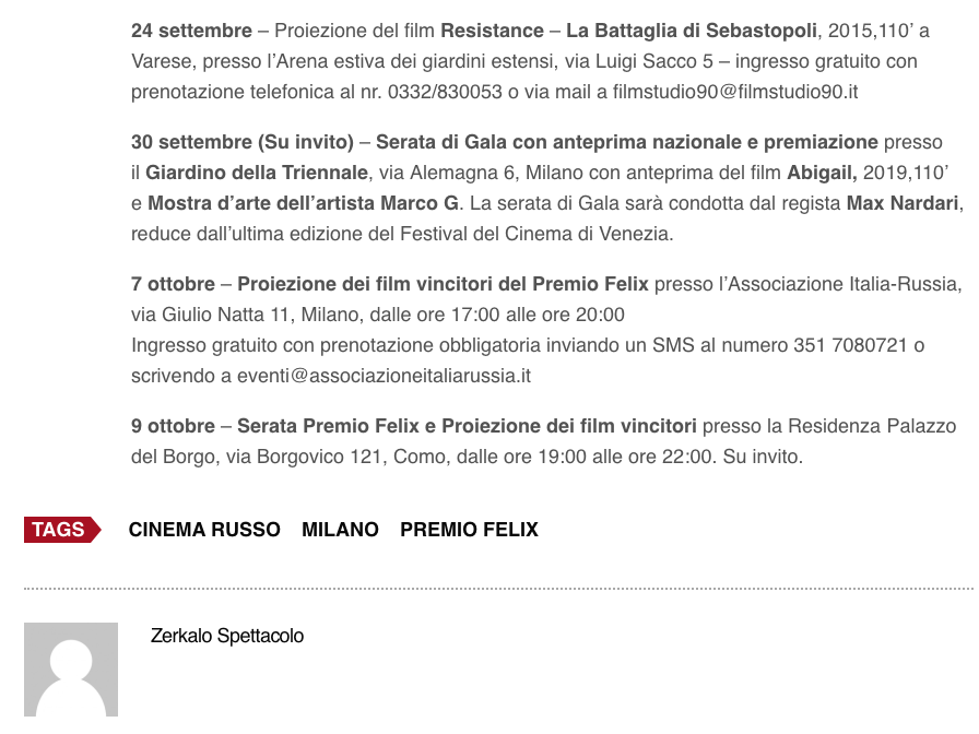 Ежегодный кинофестиваль провели итало-российская Культурная Ассоциация Феликс – кино, мода, дизайн и Ассоциация Италия-Россия под патронатом Посольства Российской Федерации в Италии и региона Ломбардия. Кинофестиваль входит официальную программу Milano Movie Week.