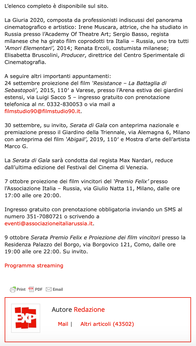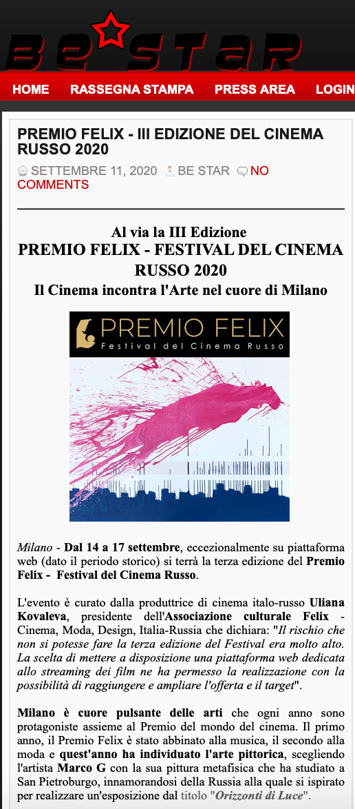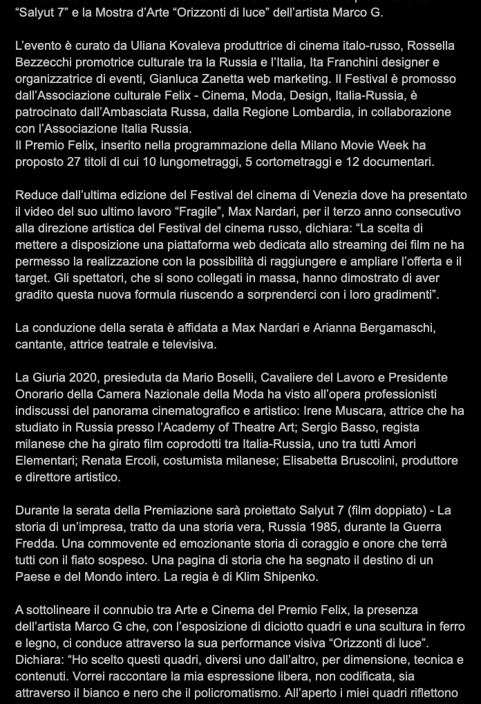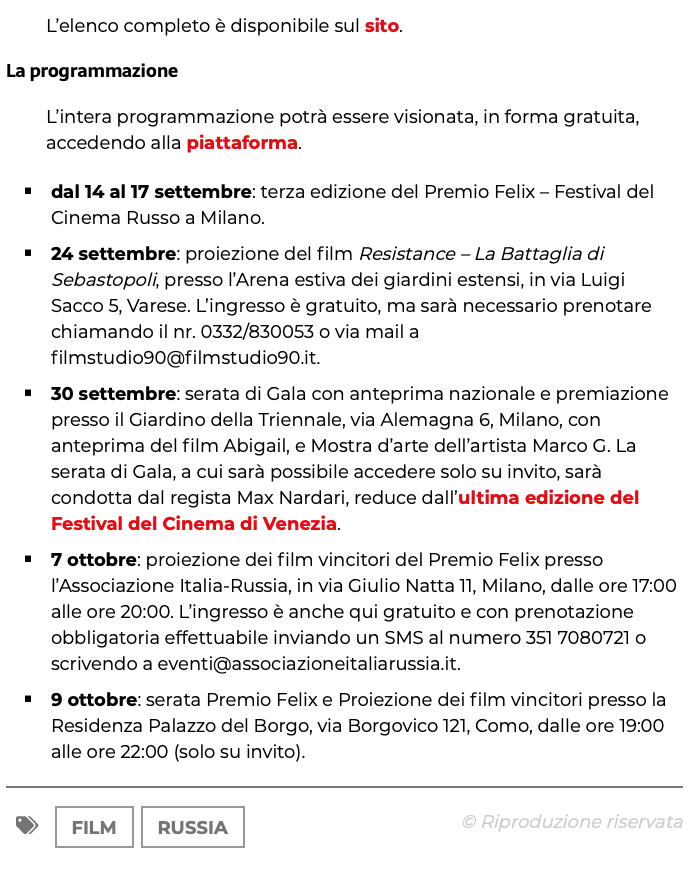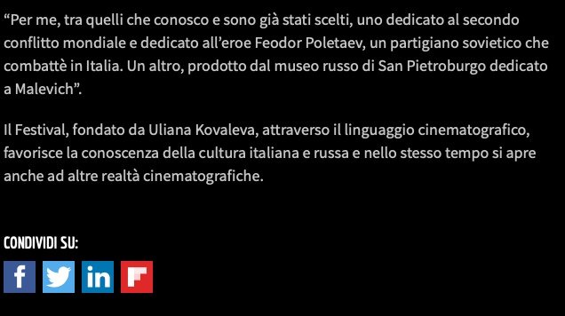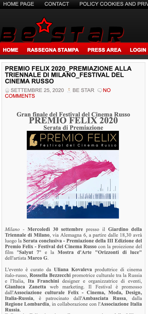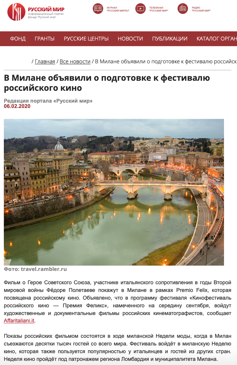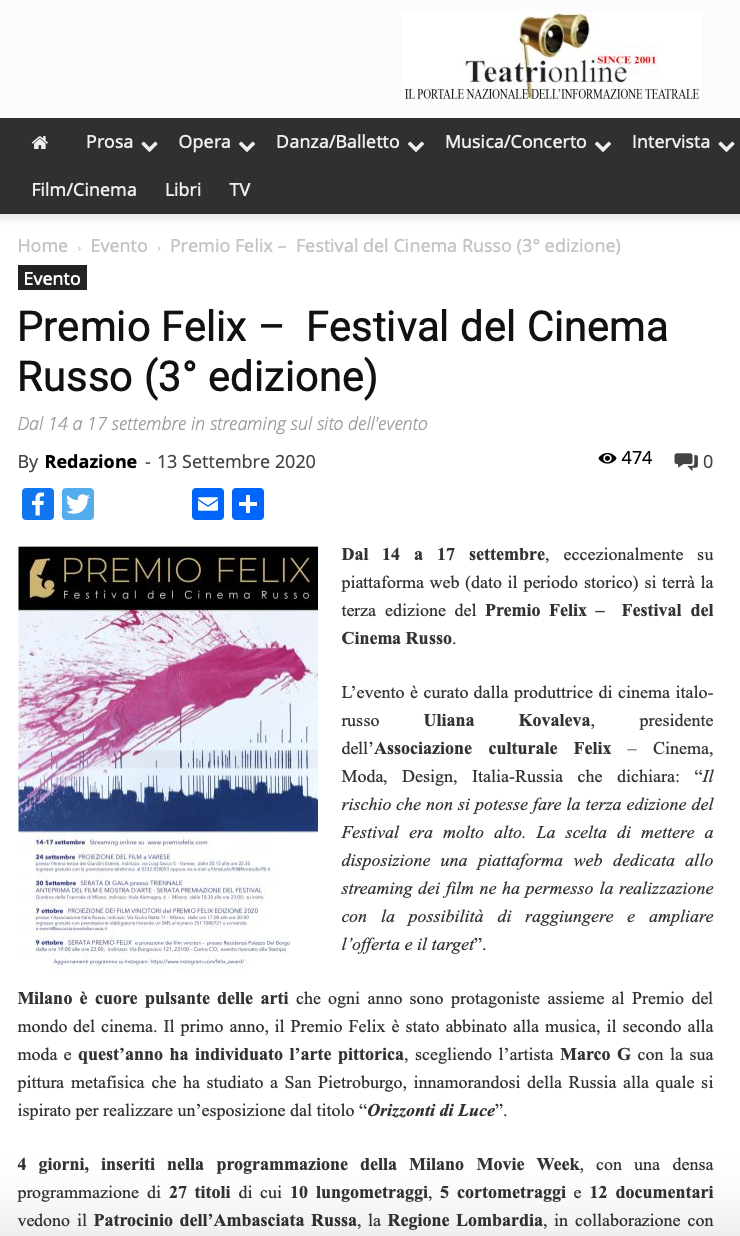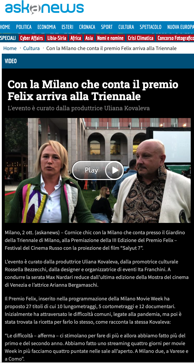 Ежегодный кинофестиваль провели итало-российская Культурная Ассоциация Феликс – кино, мода, дизайн и Ассоциация Италия-Россия под патронатом Посольства Российской Федерации в Италии и региона Ломбардия. Кинофестиваль входит официальную программу Milano Movie Week.