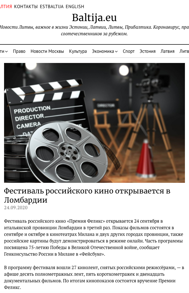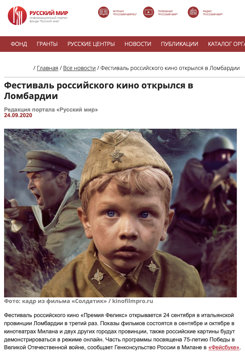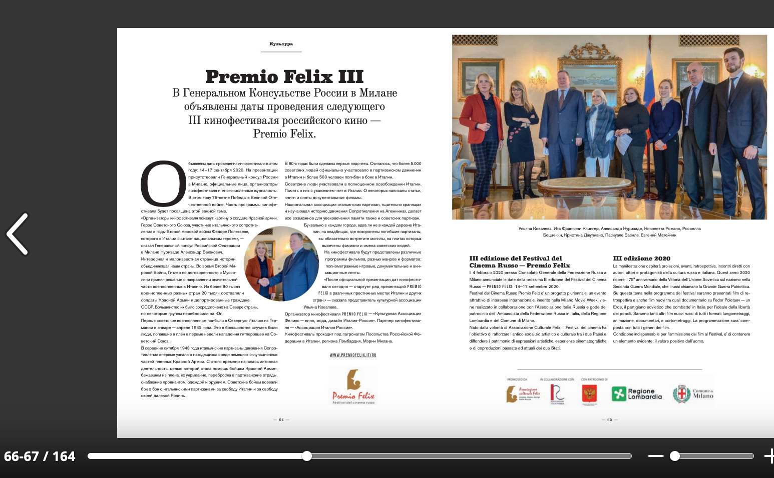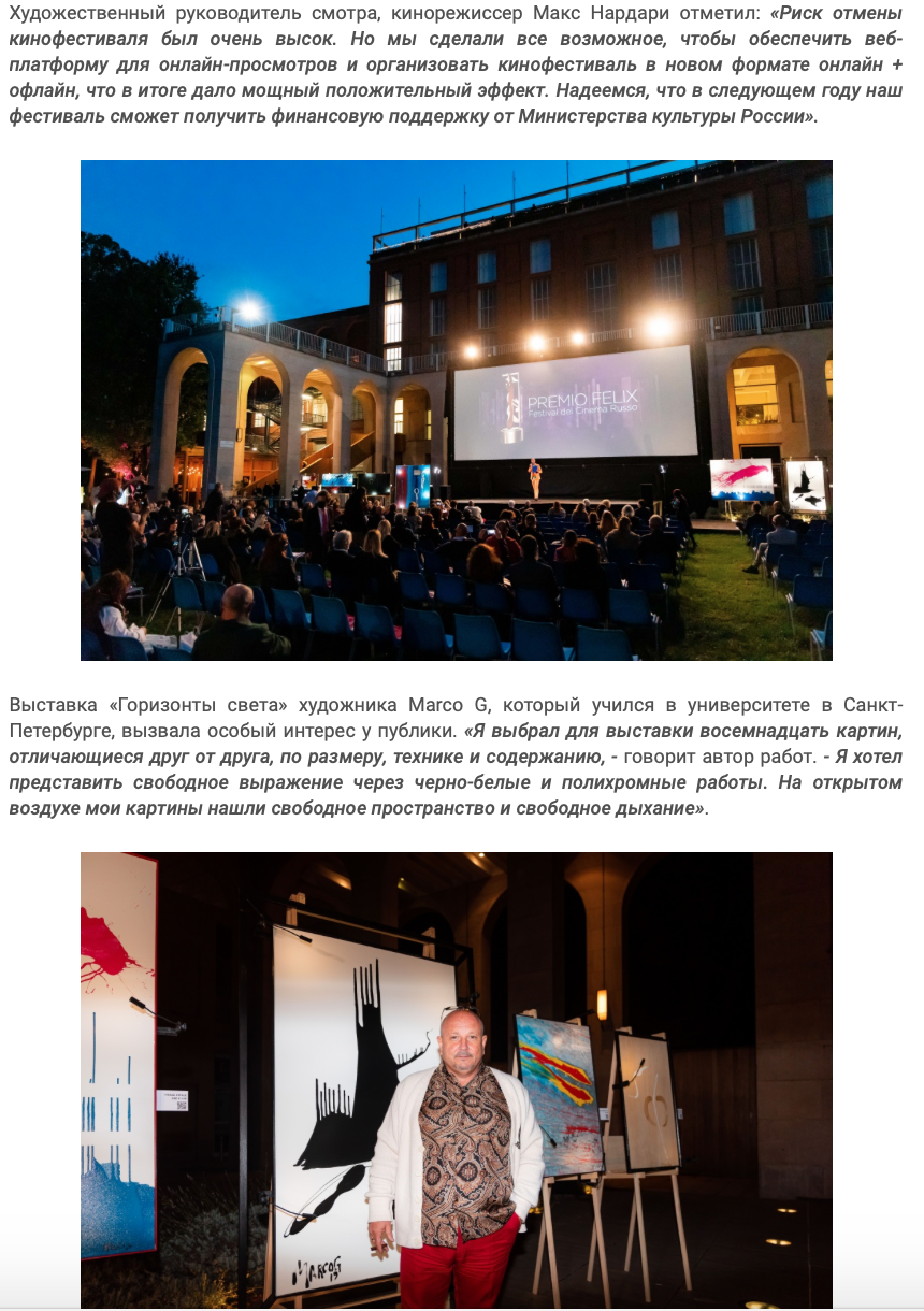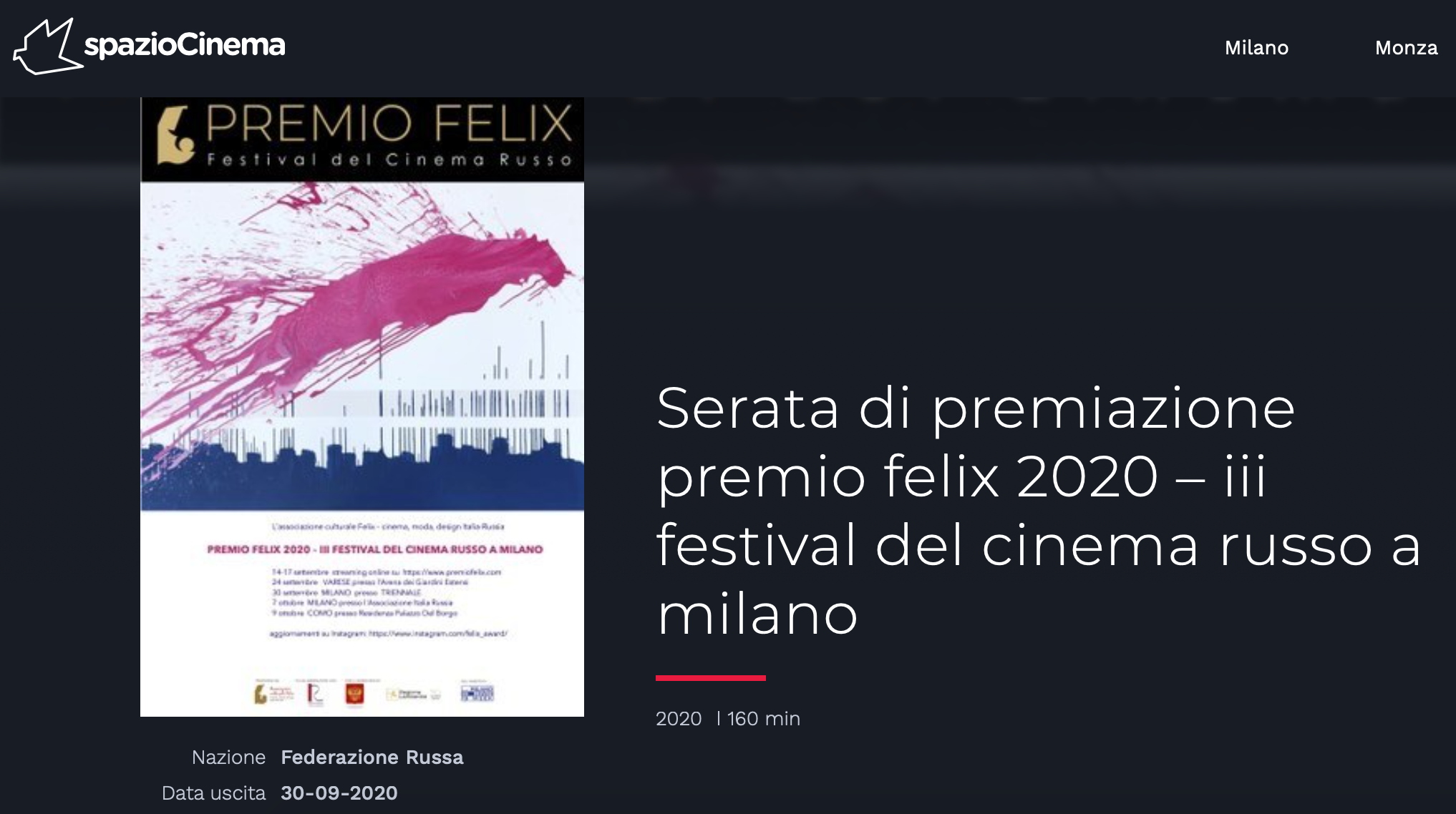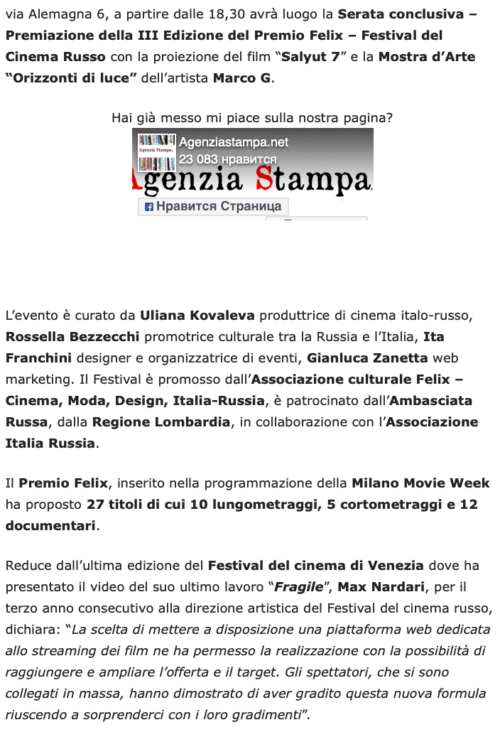 Ежегодный кинофестиваль провели итало-российская Культурная Ассоциация Феликс – кино, мода, дизайн и Ассоциация Италия-Россия под патронатом Посольства Российской Федерации в Италии и региона Ломбардия. Кинофестиваль входит официальную программу Milano Movie Week.