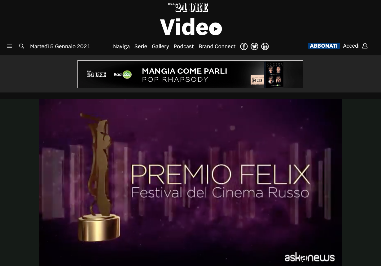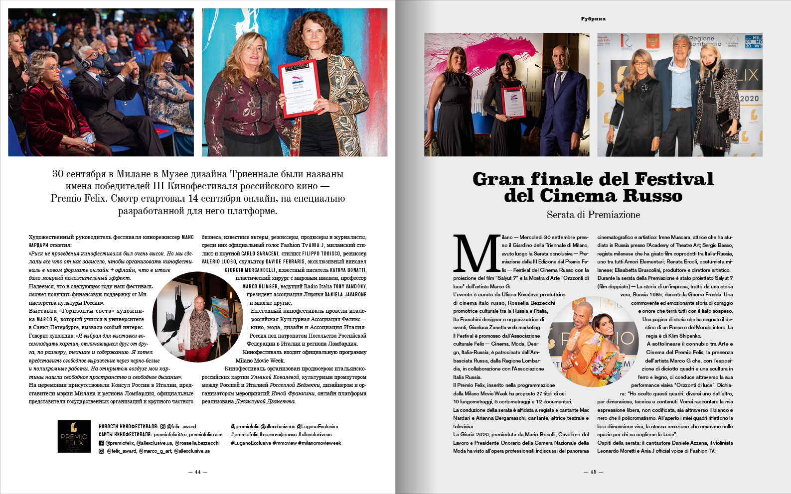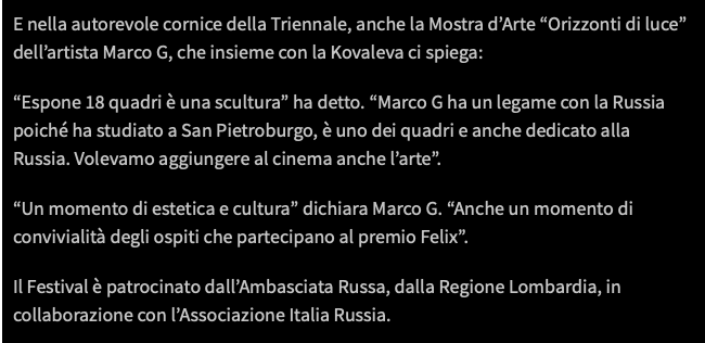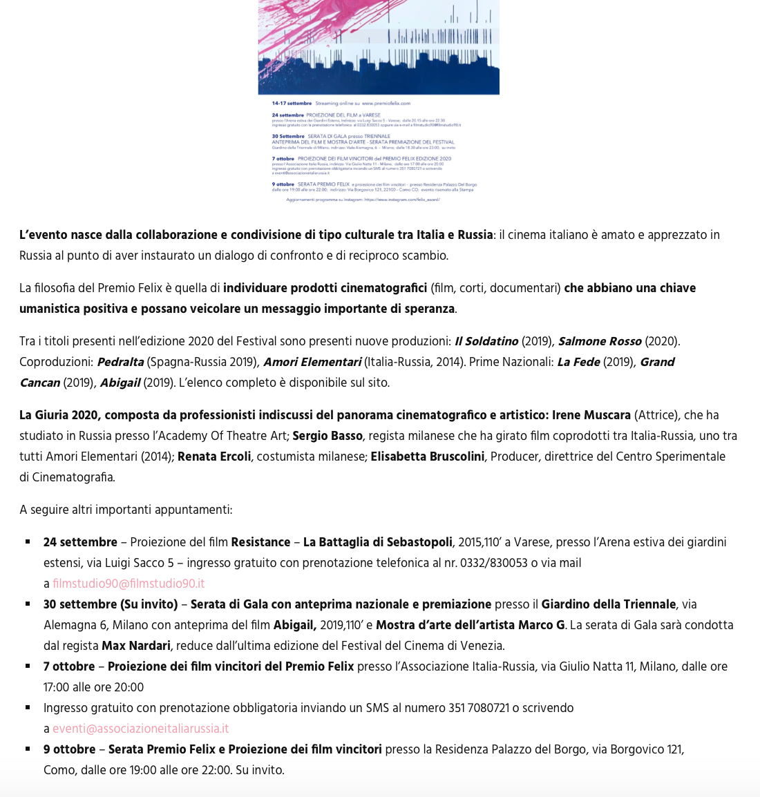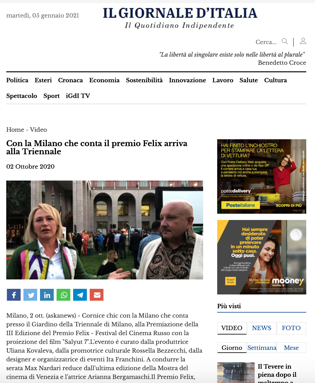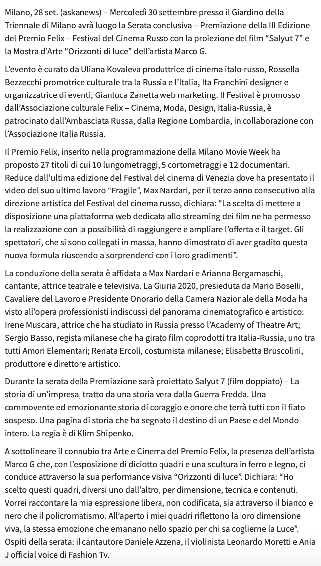 Ежегодный кинофестиваль провели итало-российская Культурная Ассоциация Феликс – кино, мода, дизайн и Ассоциация Италия-Россия под патронатом Посольства Российской Федерации в Италии и региона Ломбардия. Кинофестиваль входит официальную программу Milano Movie Week.
