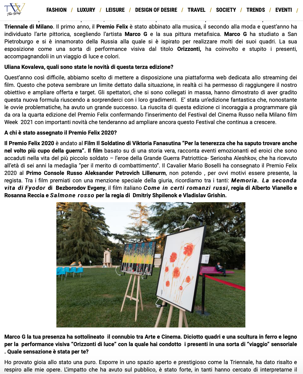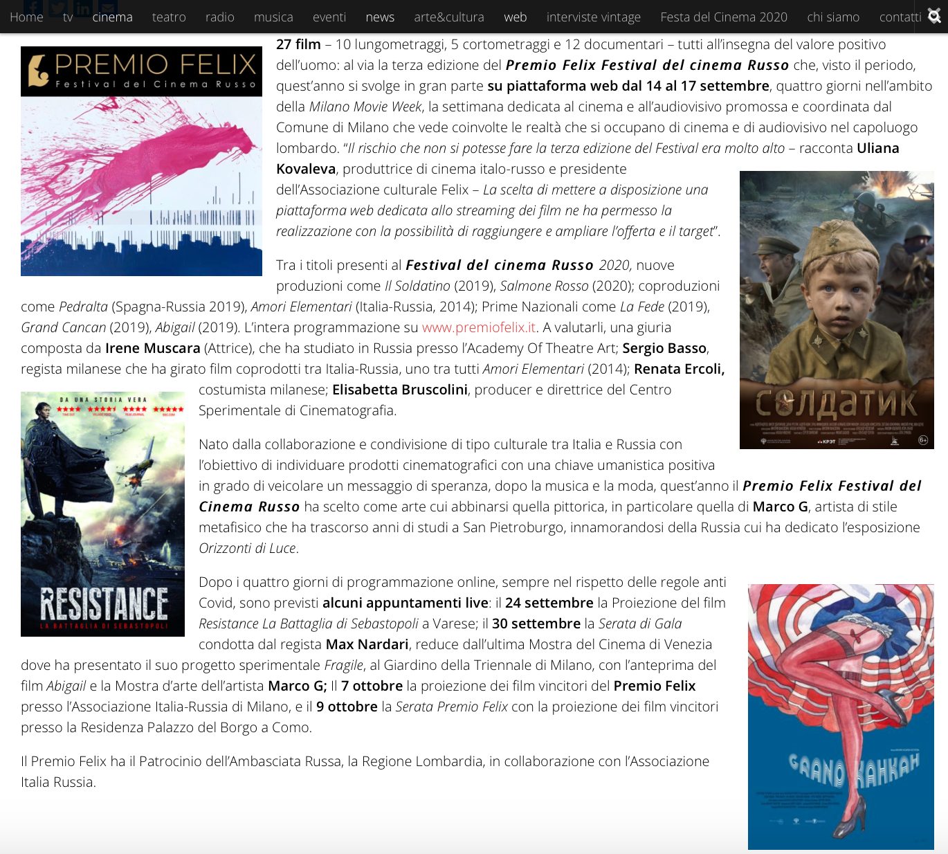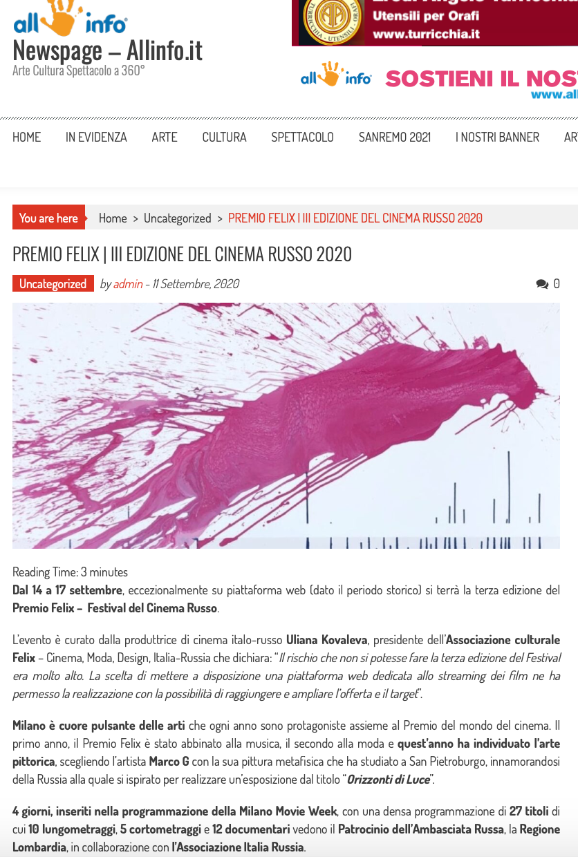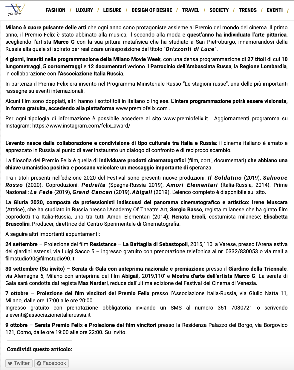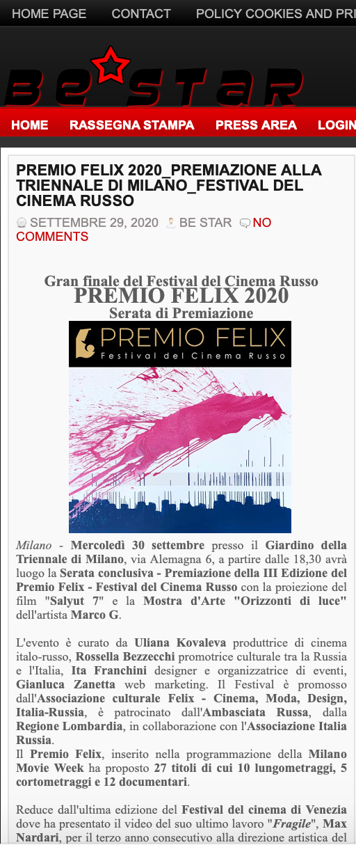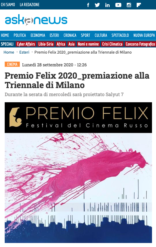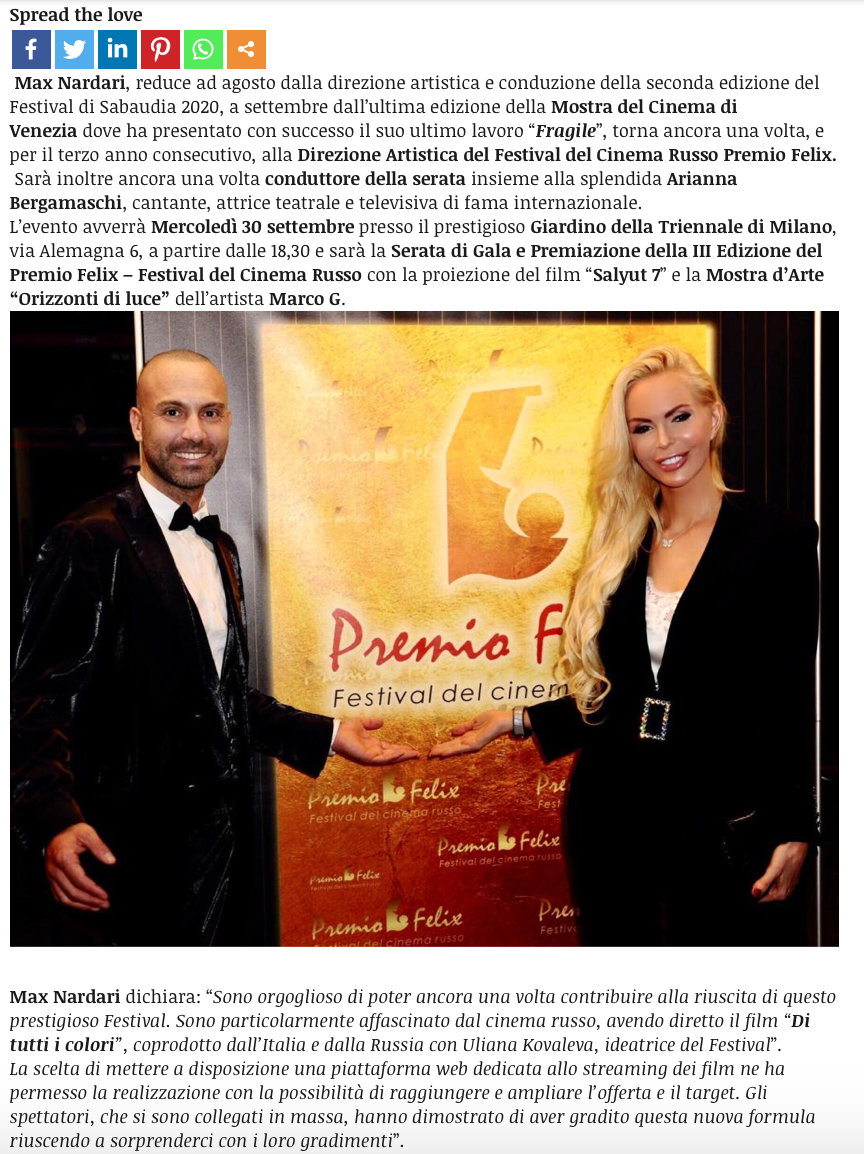 Ежегодный кинофестиваль провели итало-российская Культурная Ассоциация Феликс – кино, мода, дизайн и Ассоциация Италия-Россия под патронатом Посольства Российской Федерации в Италии и региона Ломбардия. Кинофестиваль входит официальную программу Milano Movie Week.