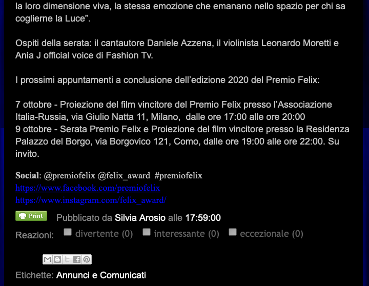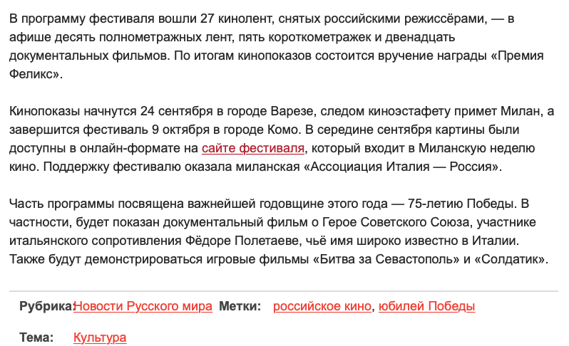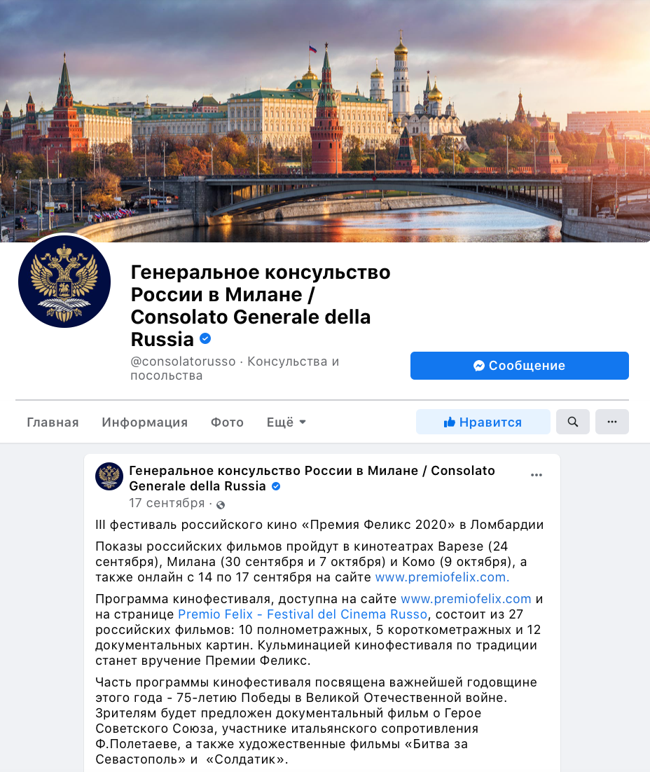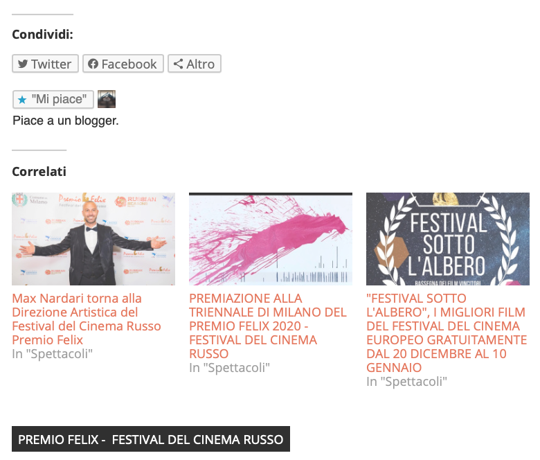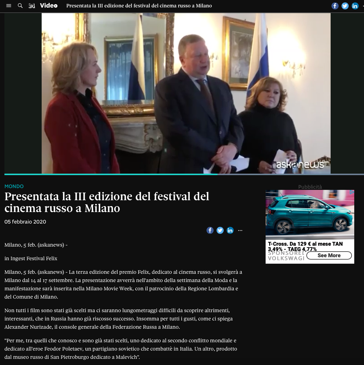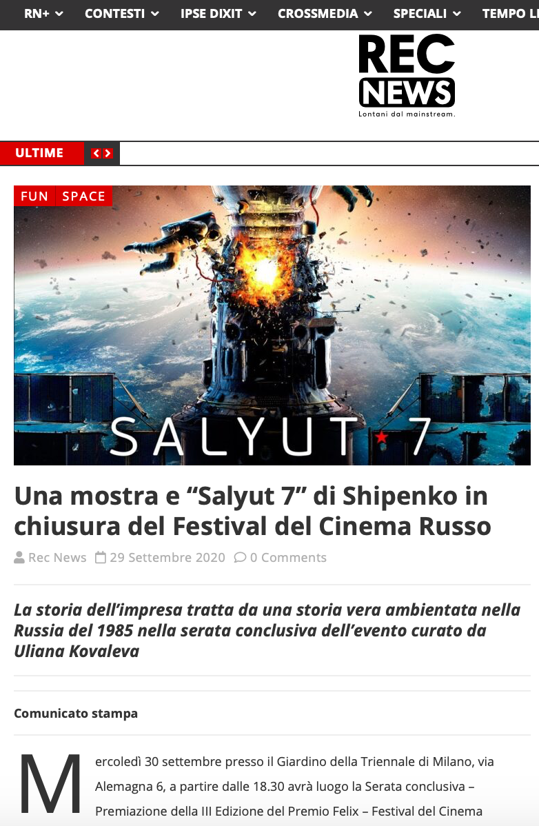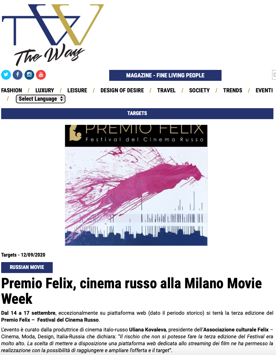 Ежегодный кинофестиваль провели итало-российская Культурная Ассоциация Феликс – кино, мода, дизайн и Ассоциация Италия-Россия под патронатом Посольства Российской Федерации в Италии и региона Ломбардия. Кинофестиваль входит официальную программу Milano Movie Week.