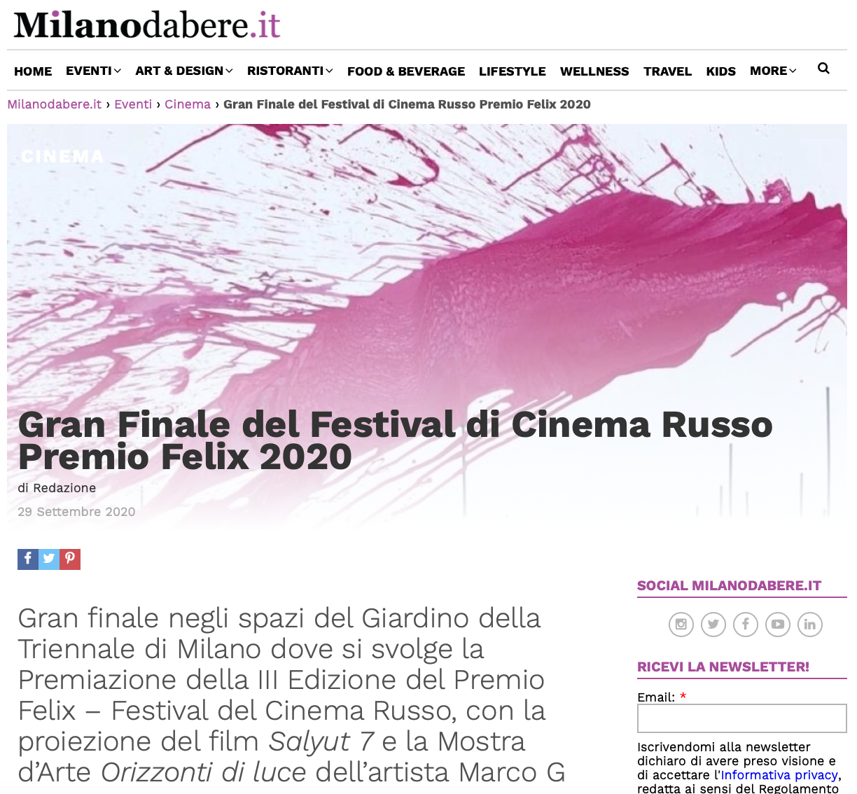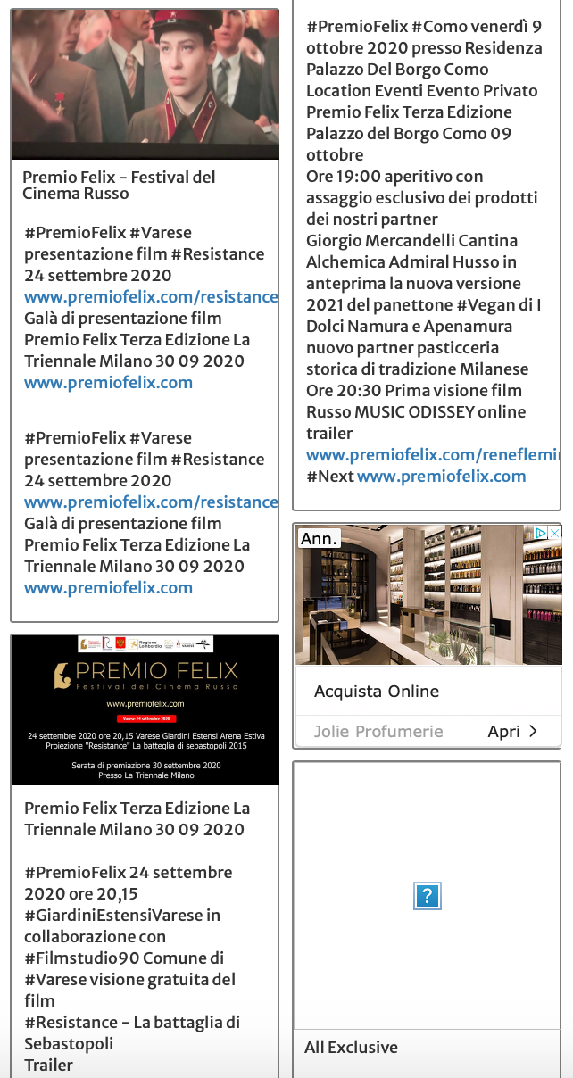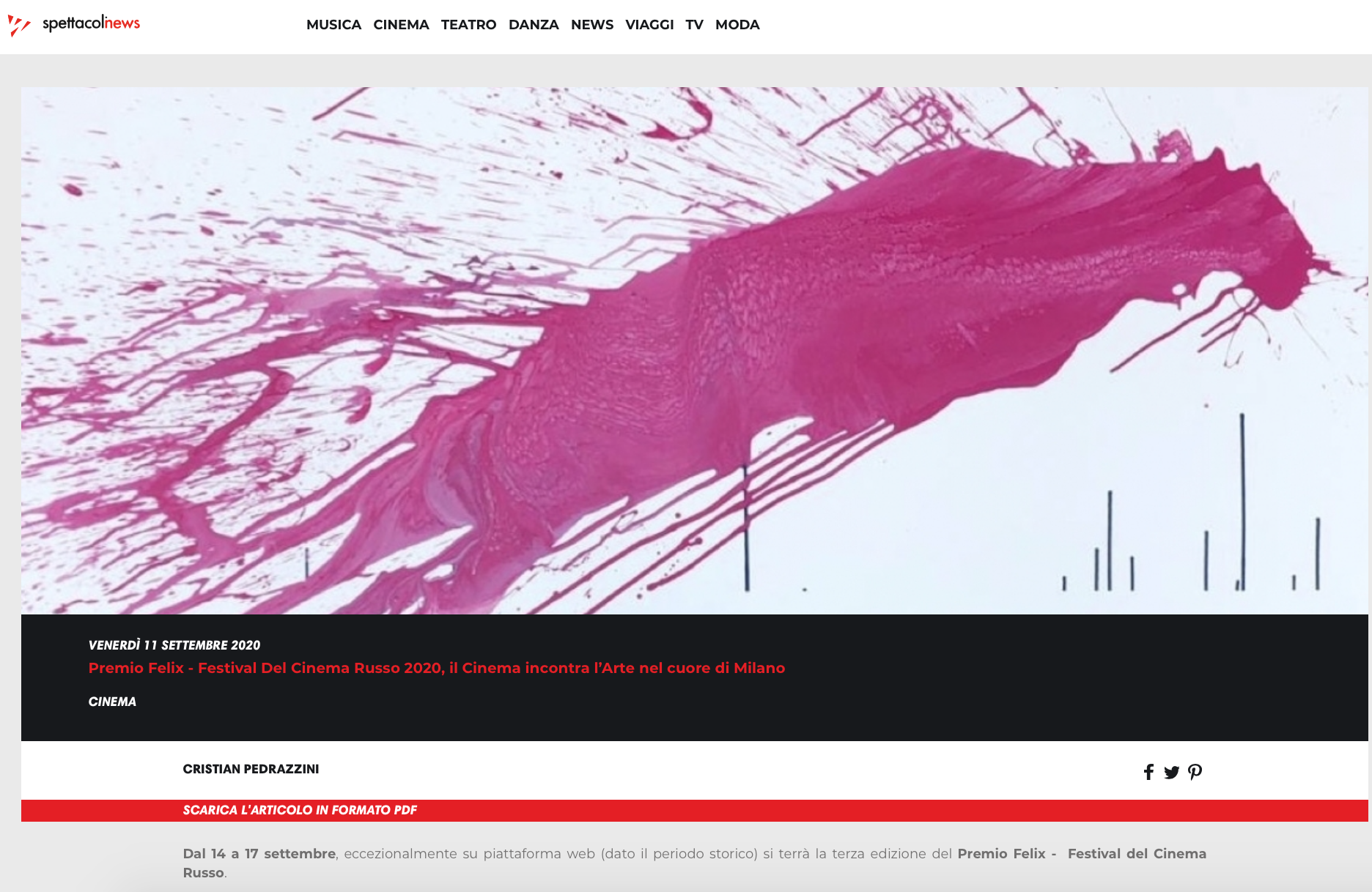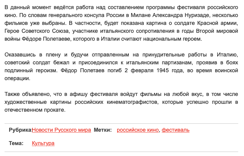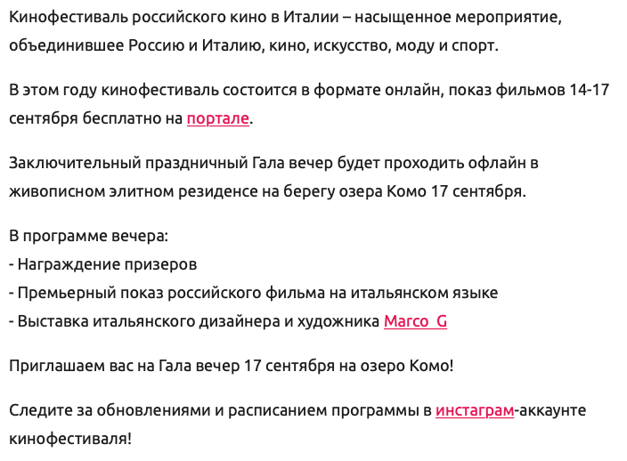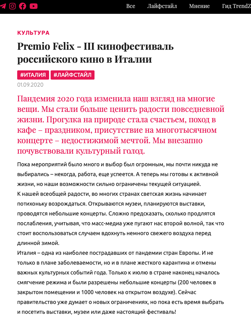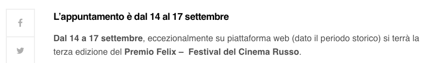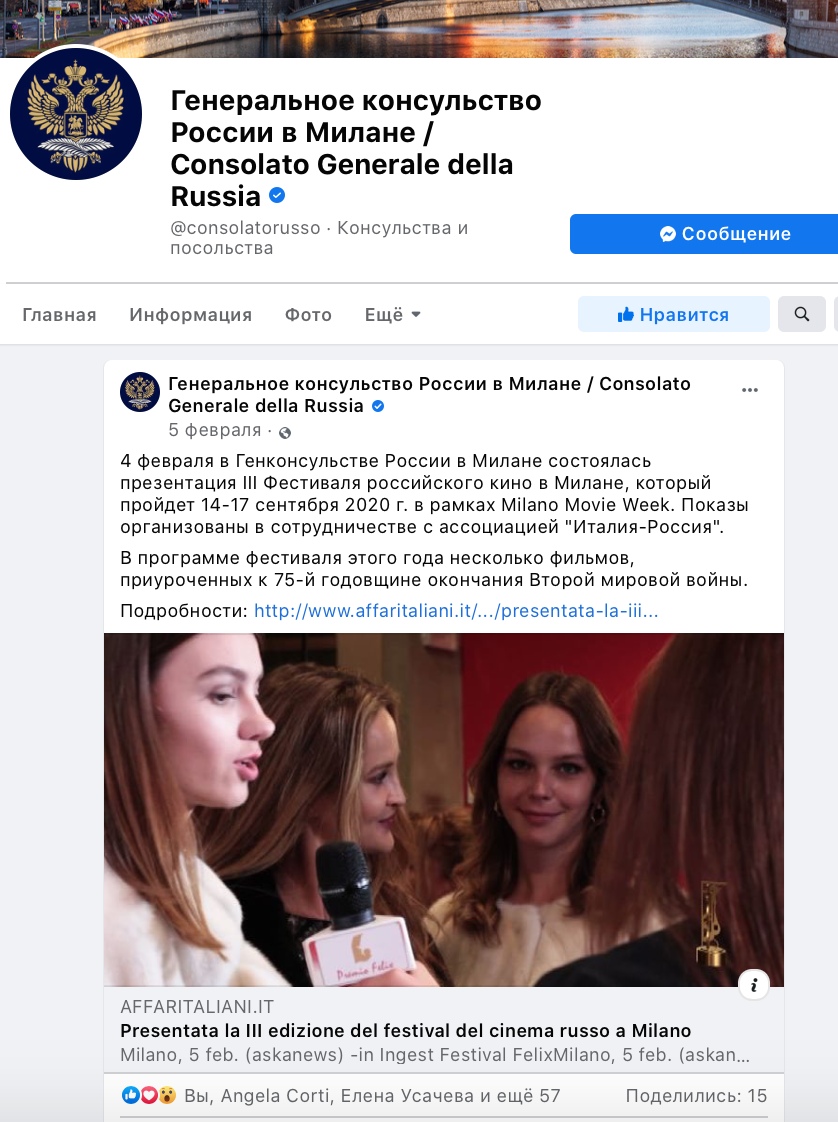 Ежегодный кинофестиваль провели итало-российская Культурная Ассоциация Феликс – кино, мода, дизайн и Ассоциация Италия-Россия под патронатом Посольства Российской Федерации в Италии и региона Ломбардия. Кинофестиваль входит официальную программу Milano Movie Week.
