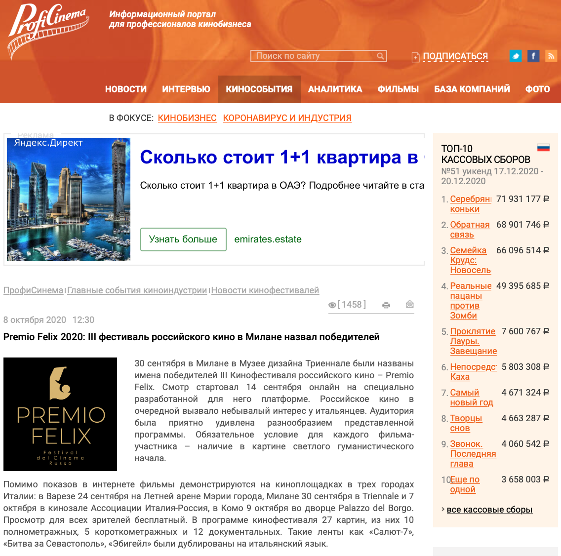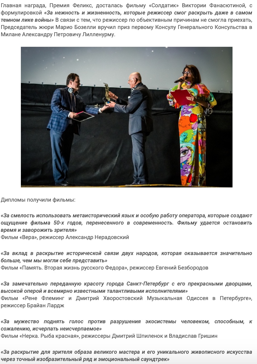 Главная награда Премия Феликс досталась фильму «Солдатик», режиссер Виктория Фанасютина, с формулировкой «За нежность и жизненность, которые режиссер смог раскрыть даже в самом темном лике войны»