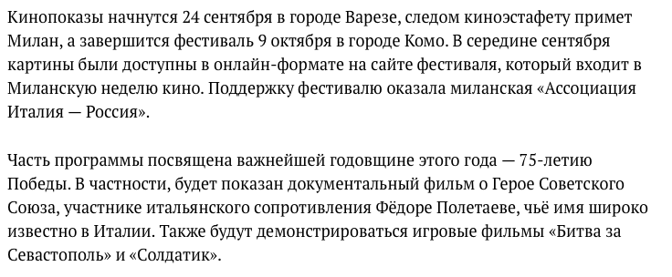 III кинофестиваль прошел на киноплощадках в трех городах Италии: в Варезе 24 сентября на Летней арене Мэрии города, Милане 30 сентября в Triennale и 7 октября в кинозале Ассоциации Италия-Россия, в Комо 9 октября во дворце Palazzo del Borgo. А также в формате онлайн, на специально разработанной для кинофестиваля платформе.